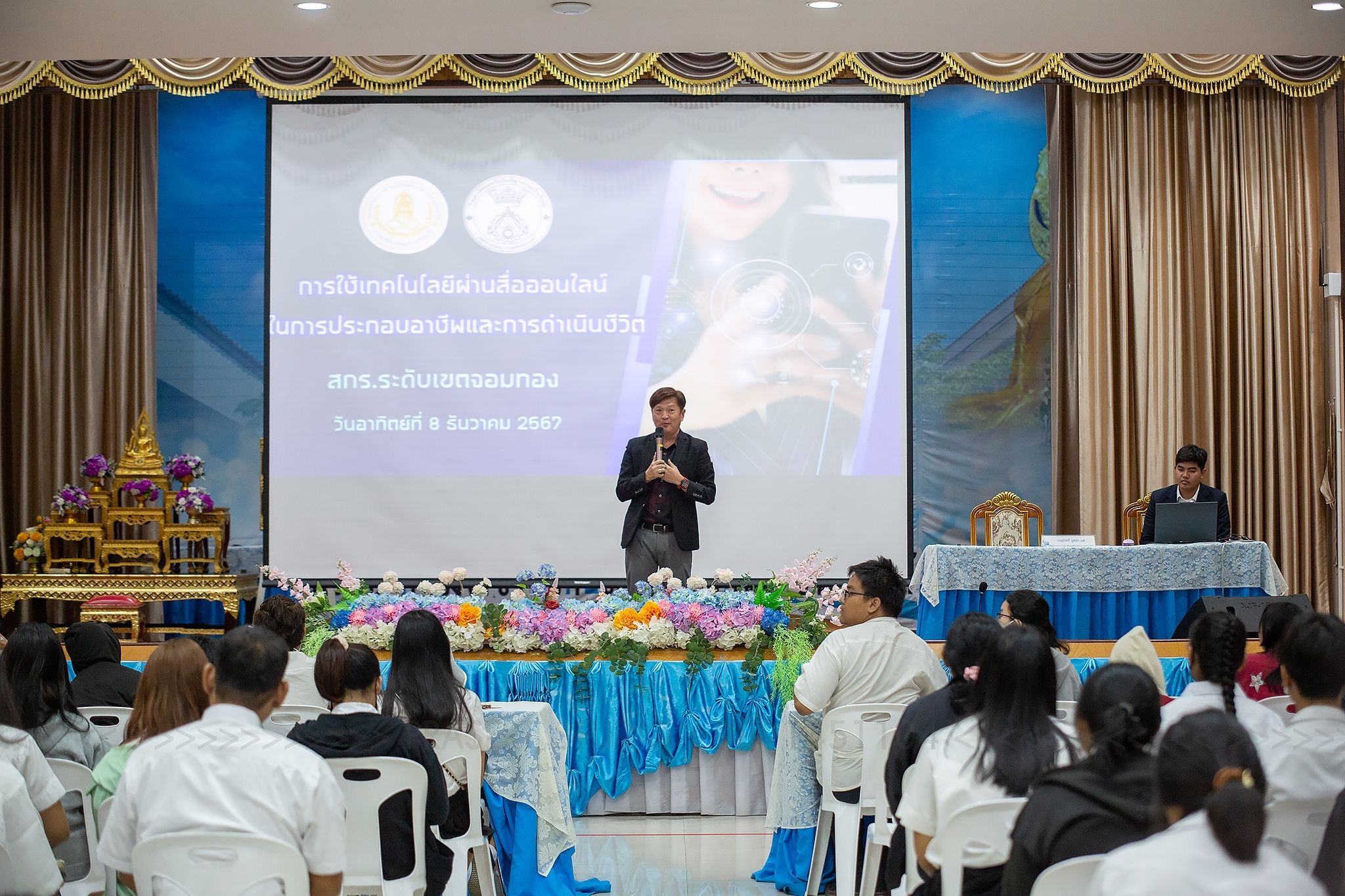 วันที่ 8 ธันวาคม 2567 นางชงโค สุรเวทวงศ์ภาส ผู้อำนวยการศูนย์ส่งเสริมการเรียนรู้ระดับเขตจอมทอง นำข้าราชการ และคณะครู จัดทำโครงการ “พัฒนาและส่งเสริมการใช้เทคโนโลยี เพื่อการประกอบอาชีพ และการดำเนินชีวิต” ให้กับนักศึกษาศูนย์ส่งเสริมการเรียนรู้ระดับเขตจอมทอง ณ หอประชุมโรงเรียนบางมดวิทยา (สีสุกหวาดจวนอุปถัมปฺ์) เขตจอมทอง กรุงเทพมหานคร