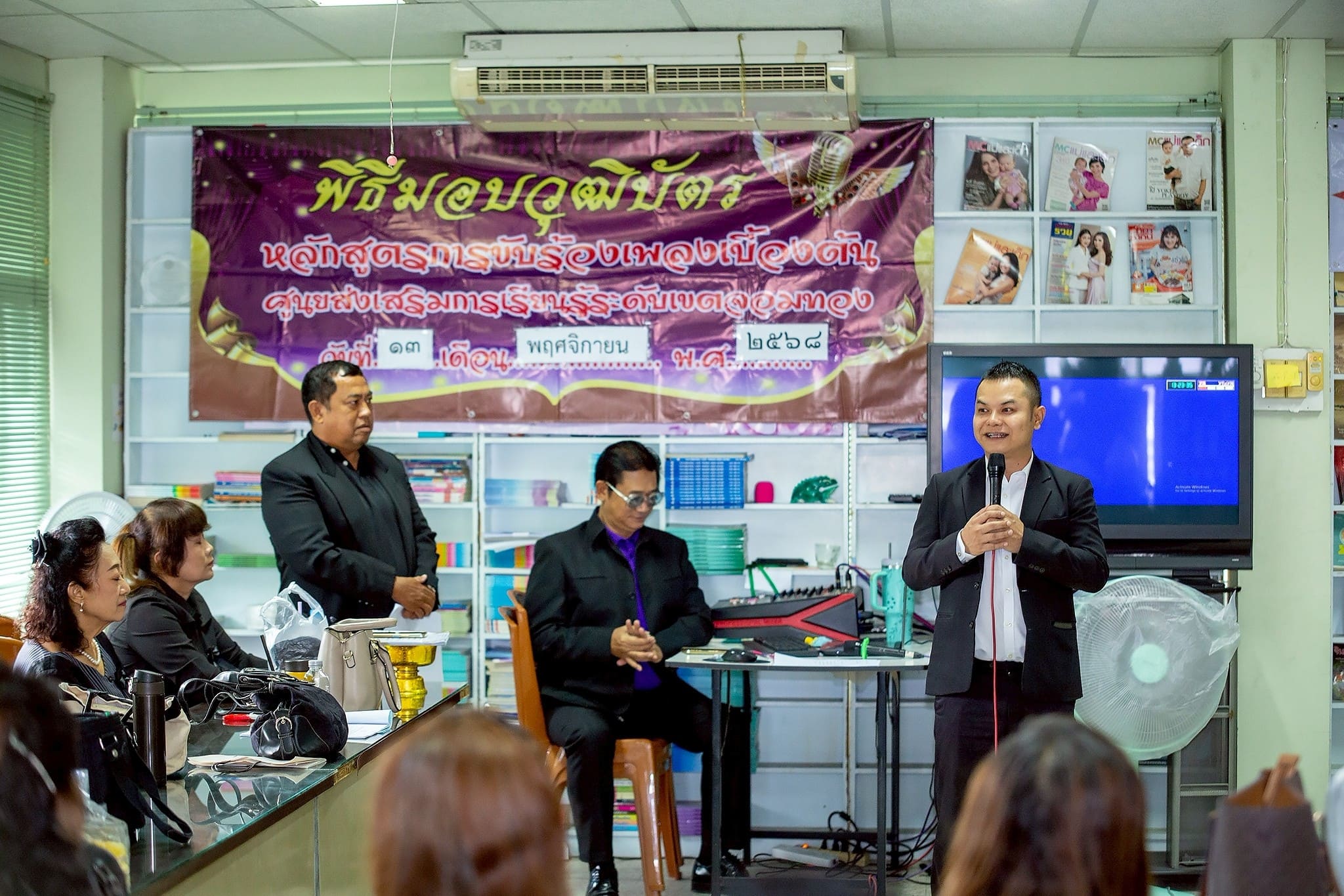 13 พฤศจิกายน 2568 นายนิวัฒน์ จันทร์เทศ ครูชำนาญการ รักษาการในตำแหน่ง ผู้อำนวยการศูนย์ส่งเสริมการเรียนรู้ระดับเขตจอมทอง ว่าที่ร้อยตรี อุทัย พลมารักษ์ ข้าราชการครู และคณะครู จัดพิธีมอบวุฒิบัตรหลักสูตรการขับร้องเพลงเบื้องต้น โดยมี อาจารย์บัญชา ธูสรานนท์ (อ.เนื้อทอง) เป็นผู้ฝึกสอน และ นายประเสริฐ สกุลเอี่ยมไพบูลย์ ผู้อำนวยการโรงเรียนดวงวิภา เป็นผู้สนับสนุนโครงการ ณ ศูนย์ส่งเสริมการเรียนรู้ระดับเขตจอมทอง สำนักงานเขตจอมทอง กรุงเทพมหานคร