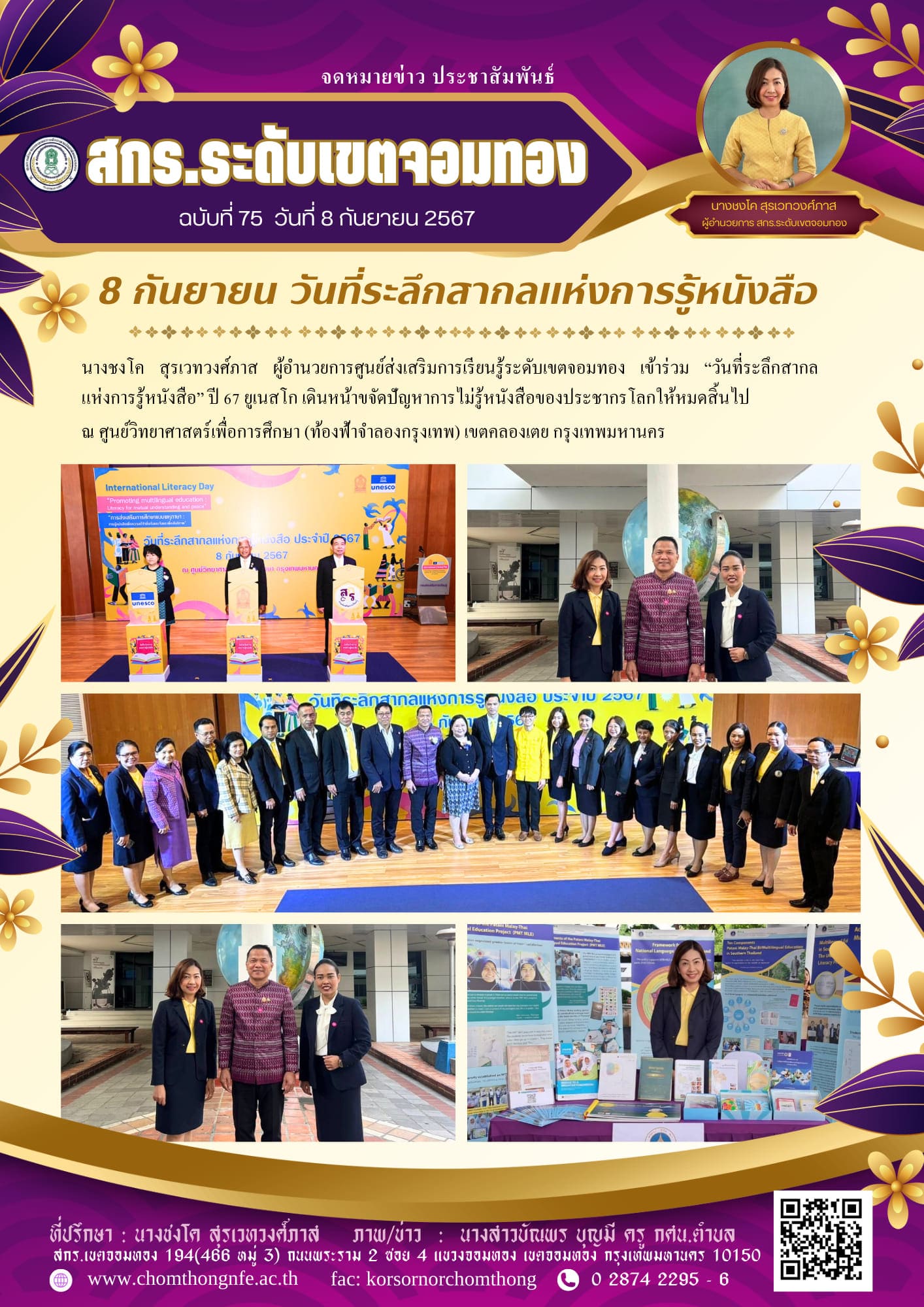 8 กันยายน 2567 นางชงโค สุรเวทวงศ์ภาส ผู้อำนวยการศูนย์ส่งเสริมการเรียนรู้ระดับเขตจอมทอง เข้าร่วม “วันที่ระลึกสากล แห่งการรู้หนังสือ” ปี 67 ยูเนสโก เดินหน้าขจัดปัญหาการไม่รู้หนังสือของประชากรโลกให้หม