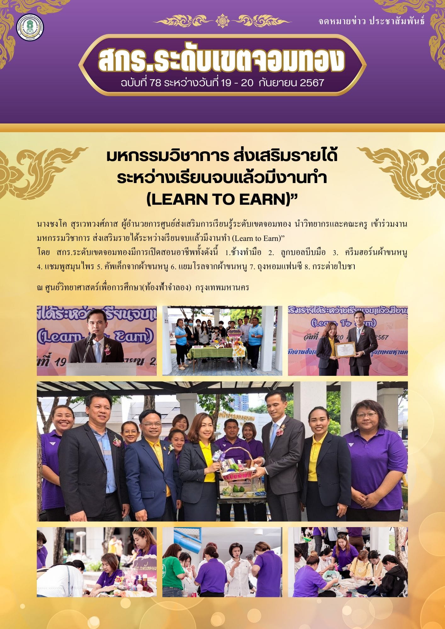 ระหว่างวันที่ 19 - 20 กันยายน 2567 #มหกรรมวิชาการส่งเสริมรายได้ระหว่างเรียนจบแล้วมีงานทำ(Learn to Earn)”นางชงโค สุรเวทวงศ์ภาส ผู้อำนวยการศูนย์ส่งเสริมการเรียนรู้ระดับเขตจอมทอง นำวิทยากรและคณะครู เข้า
