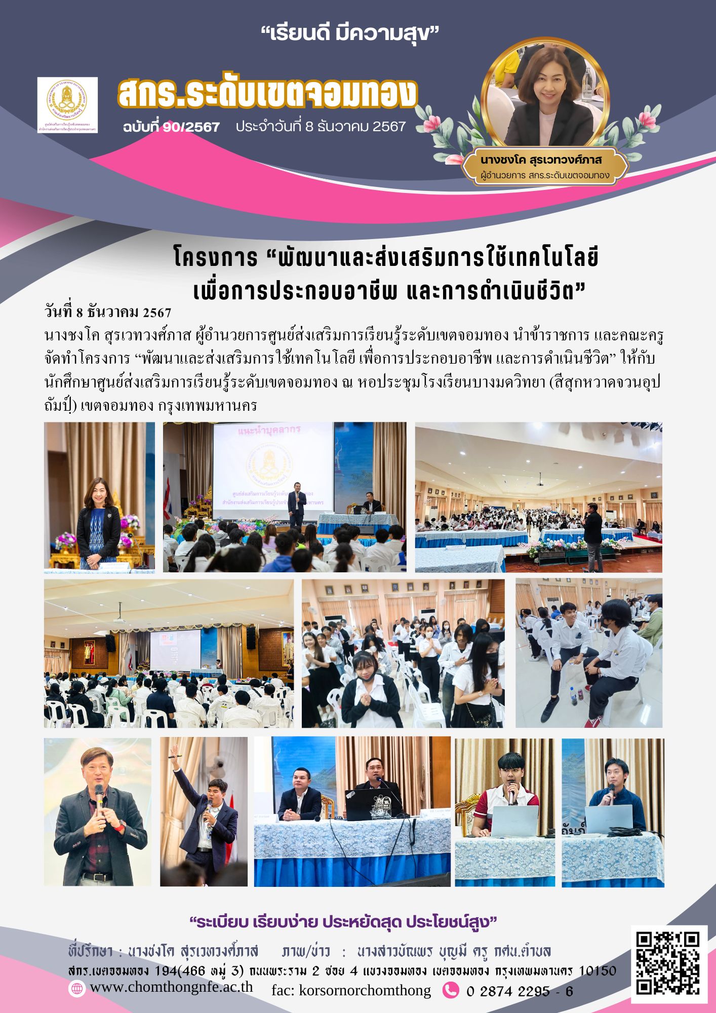วันที่ 8 ธันวาคม 2567 นางชงโค สุรเวทวงศ์ภาส ผู้อำนวยการศูนย์ส่งเสริมการเรียนรู้ระดับเขตจอมทอง นำข้าราชการ และคณะครู จัดทำโครงการ “พัฒนาและส่งเสริมการใช้เทคโนโลยี เพื่อการประกอบอาชีพ และการดำเนินชีวิต” ให้กับนักศึกษาศูนย์ส่งเสริมการเรียนรู้ระดับเขตจอมทอง ณ หอประชุมโรงเรียนบางมดวิทยา (สีสุกหวาดจวนอุปถัมปฺ์) เขตจอมทอง กรุงเทพมหานคร