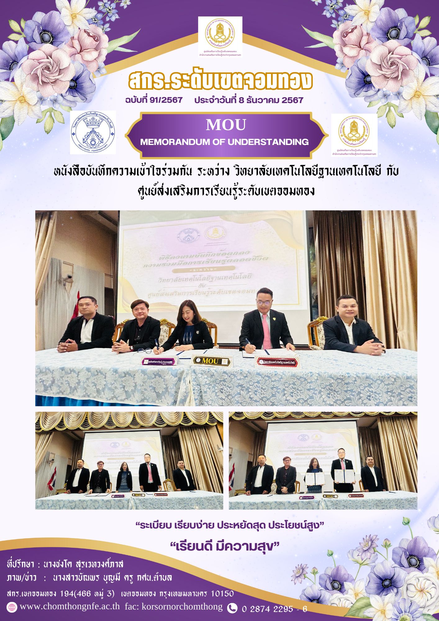 8 ธันวาคม 2567 Memorandum of Understanding (MOU) หนังสือบันทึกความเข้าใจร่วมกัน ระหว่าง วิทยาลัยเทคโนโลยีฐานเทคโนโลยี กับ สงเสริมการเรียนรู้ระดับเขตจอมทอง