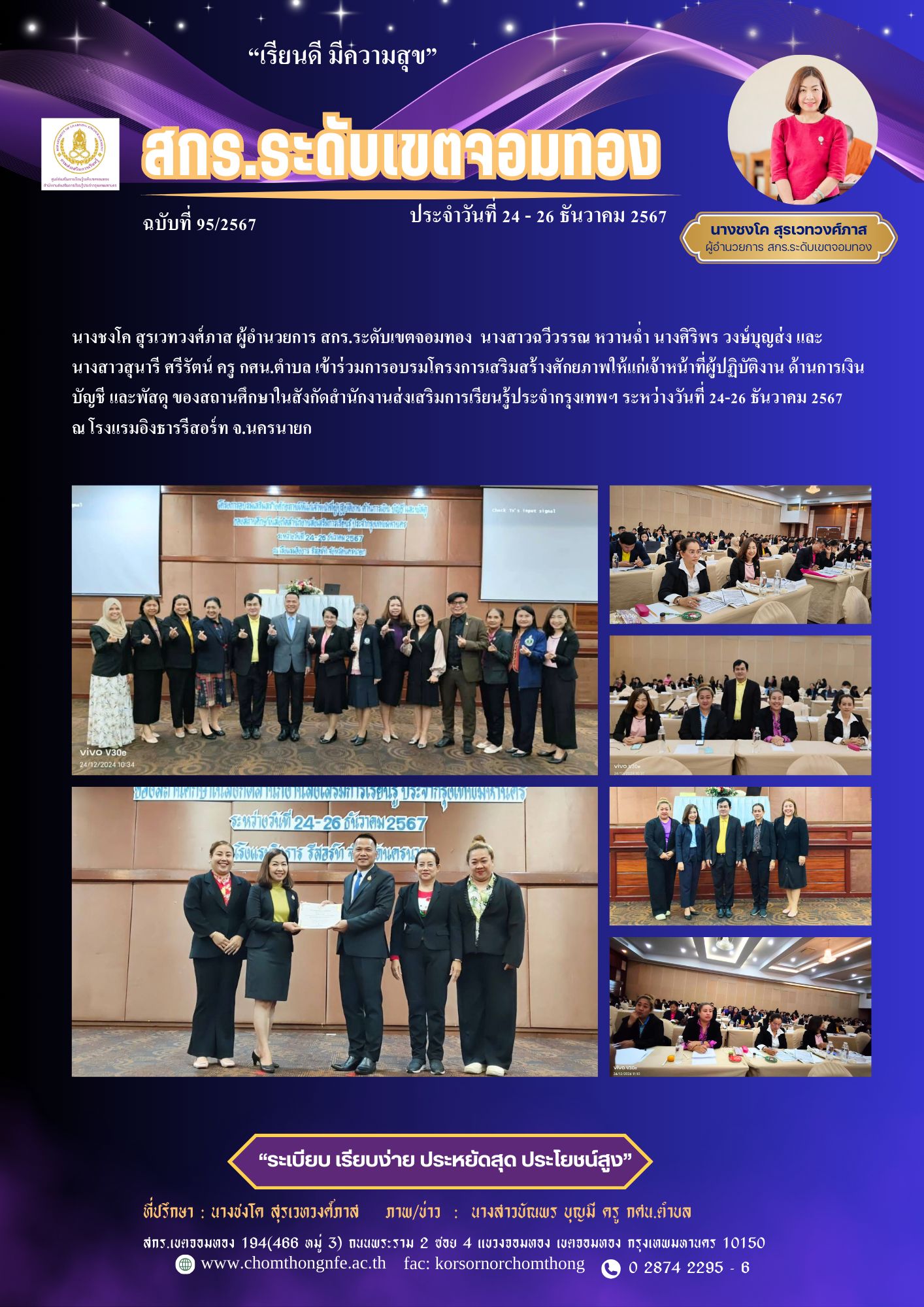 นางชงโค สุรเวทวงศ์ภาส ผู้อำนวยการ สกร.ระดับเขตจอมทอง นางสาวฉวีวรรณ หวานฉ่ำ นางศิริพร วงษ์บุญส่ง และนางสาวสุนารี ศรีรัตน์ ครู กศน.ตำบลเข้าร่วมการอบรมโครงการเสริมสร้างศักยภาพให้แก่เจ้าหน้าที่ผู้ปฏิบัติงาน ด้านการเงิน บัญชี และพัสดุของสถานศึกษาในสังกัดสำนักงานส่งเสริมการเรียนรู้ประจำกรุงเทพฯ ระหว่างวันที่ 24-26 ธันวาคม 2567 ณ โรงแรมอิงธารรีสอร์ท จ.นครนายก