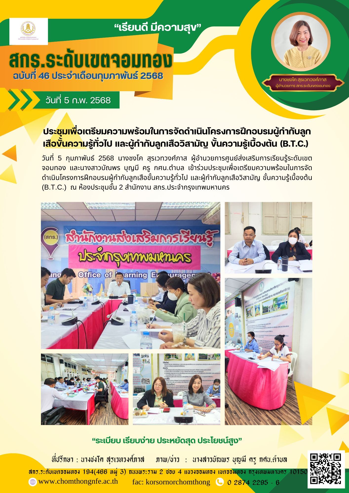 วันที่ 5 กุมภาพันธ์ 2568 นางชงโค สุรเวทวงศ์ภาส ผู้อำนวยการศูนย์ส่งเสริมการเรียนรู้ระดับเขตจอมทอง และ