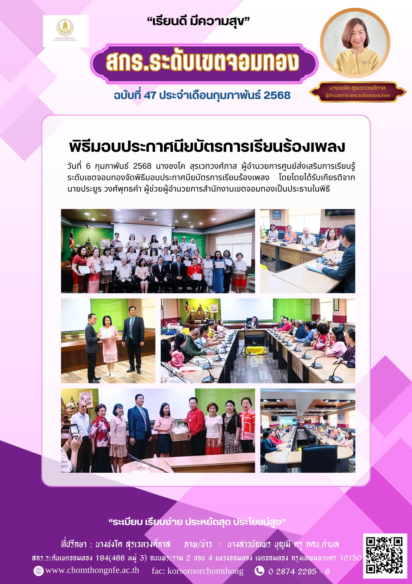 วันที่ 5 กุมภาพันธ์ 2568 นางชงโค สุรเวทวงศ์ภาส ผู้อำนวยการศูนย์ส่งเสริมการเรียนรู้ระดับเขตจอมทอง และ