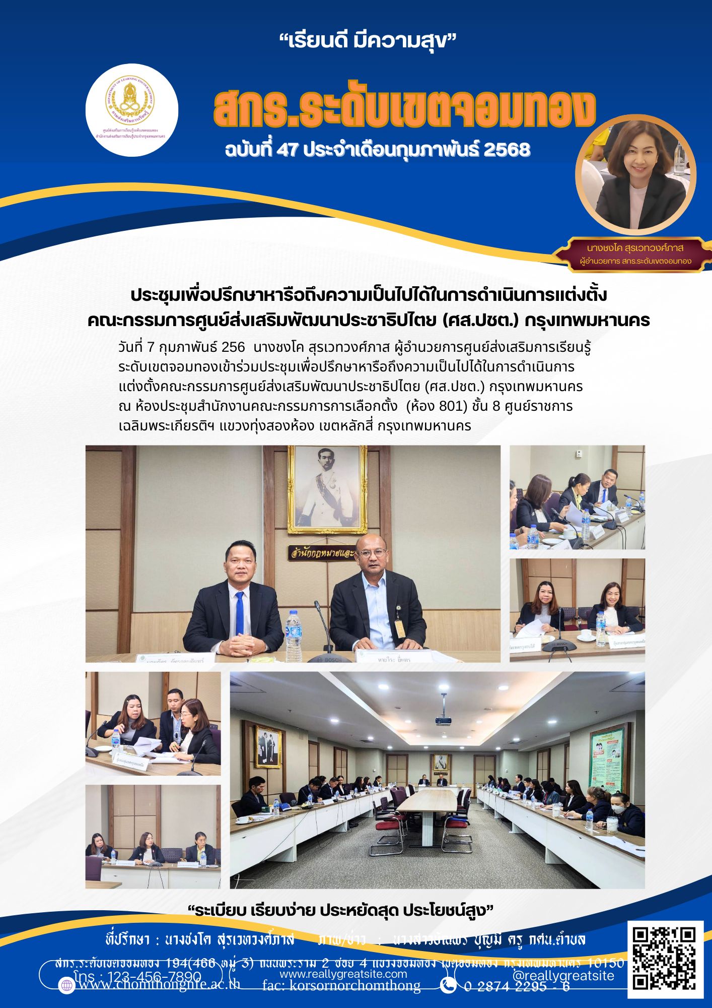 7 กุมภาพันธ์ 256 นางชงโค สุรเวทวงศ์ภาส ผู้อำนวยการศูนย์ส่งเสริมการเรียนรู้ระดับเขตจอมทองเข้าร่วมประชุมเพื่อปรึกษาหารือถึงความเป็นไปได้ในการดำเนินการแต่งตั้งคณะกรรมการศูนย์ส่งเสริมพัฒนาประชาธิปไตย (ศส
