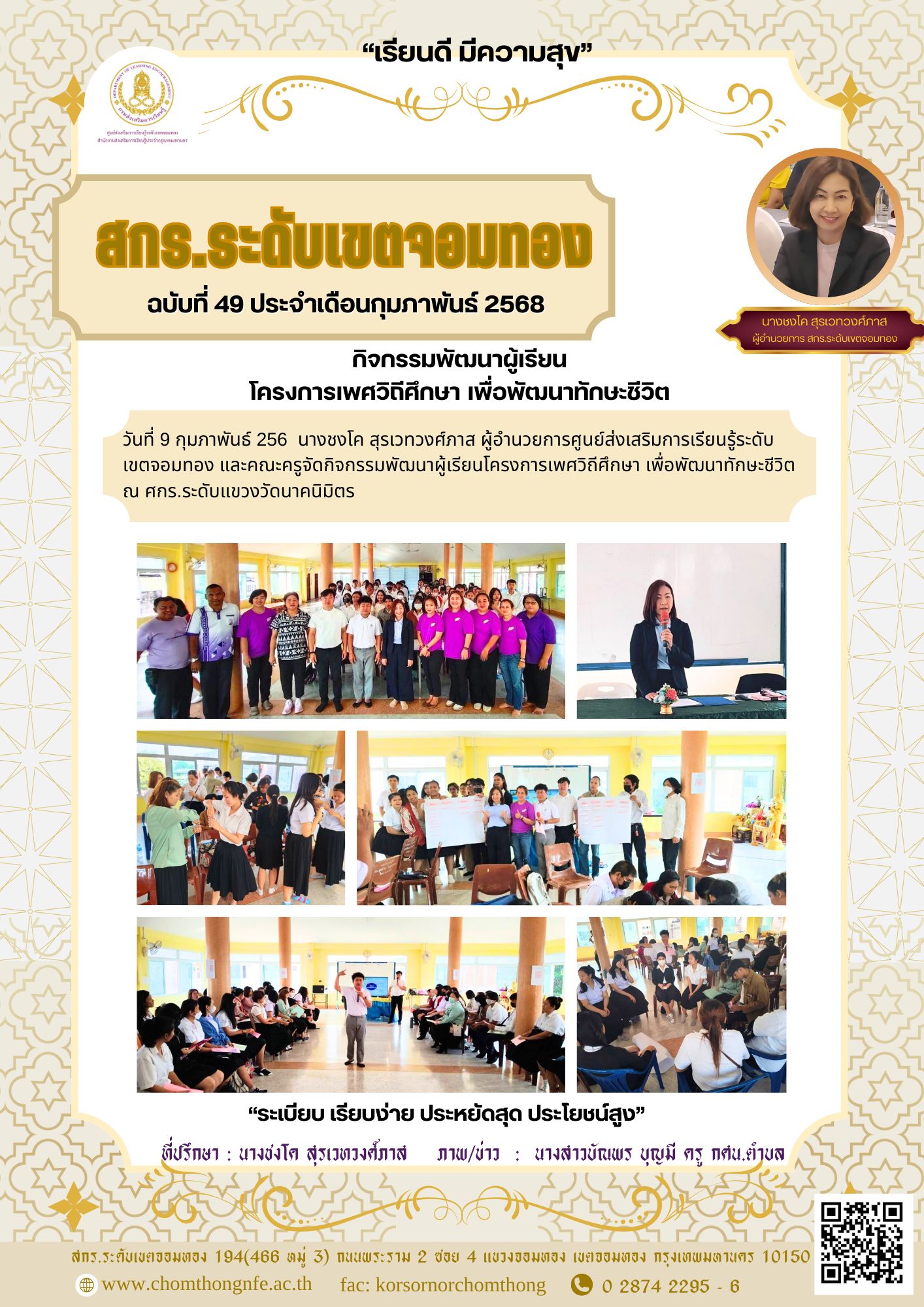 9 กุมภาพันธ์ 256 นางชงโค สุรเวทวงศ์ภาส ผู้อำนวยการศูนย์ส่งเสริมการเรียนรู้ระดับเขตจอมทอง และคณะครูจัดกิจกรรมพัฒนาผู้เรียนโครงการเพศวิถีศึกษา เพื่อพัฒนาทักษะชีวิต ณ ศกร.ระดับแขวงวัดนาคนิมิตร