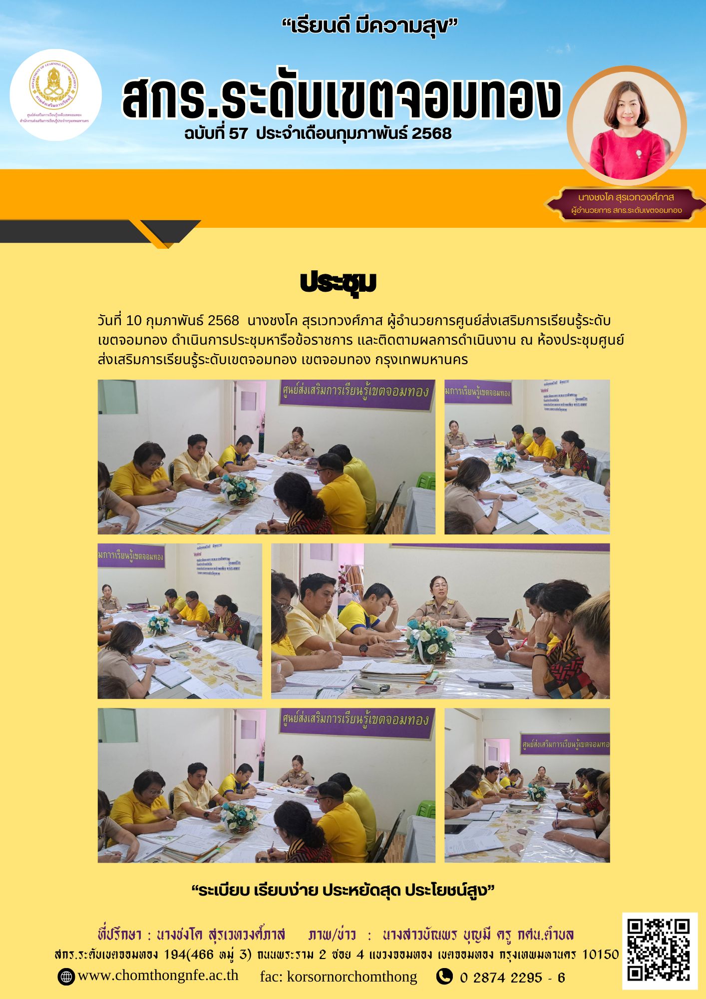 10 กุมภาพันธ์ 2568 นางชงโค สุรเวทวงศ์ภาส ผู้อำนวยการศูนย์ส่งเสริมการเรียนรู้ระดับเขตจอมทอง ดำเนินการประชุมหารือข้อราชการ และติดตามผลการดำเนินงาน ณ ห้องประชุมศูนย์ส่งเสริมการเรียนรู้ระดับเขตจอมทอง เขตจอมทอง กรุงเทพมหานคร