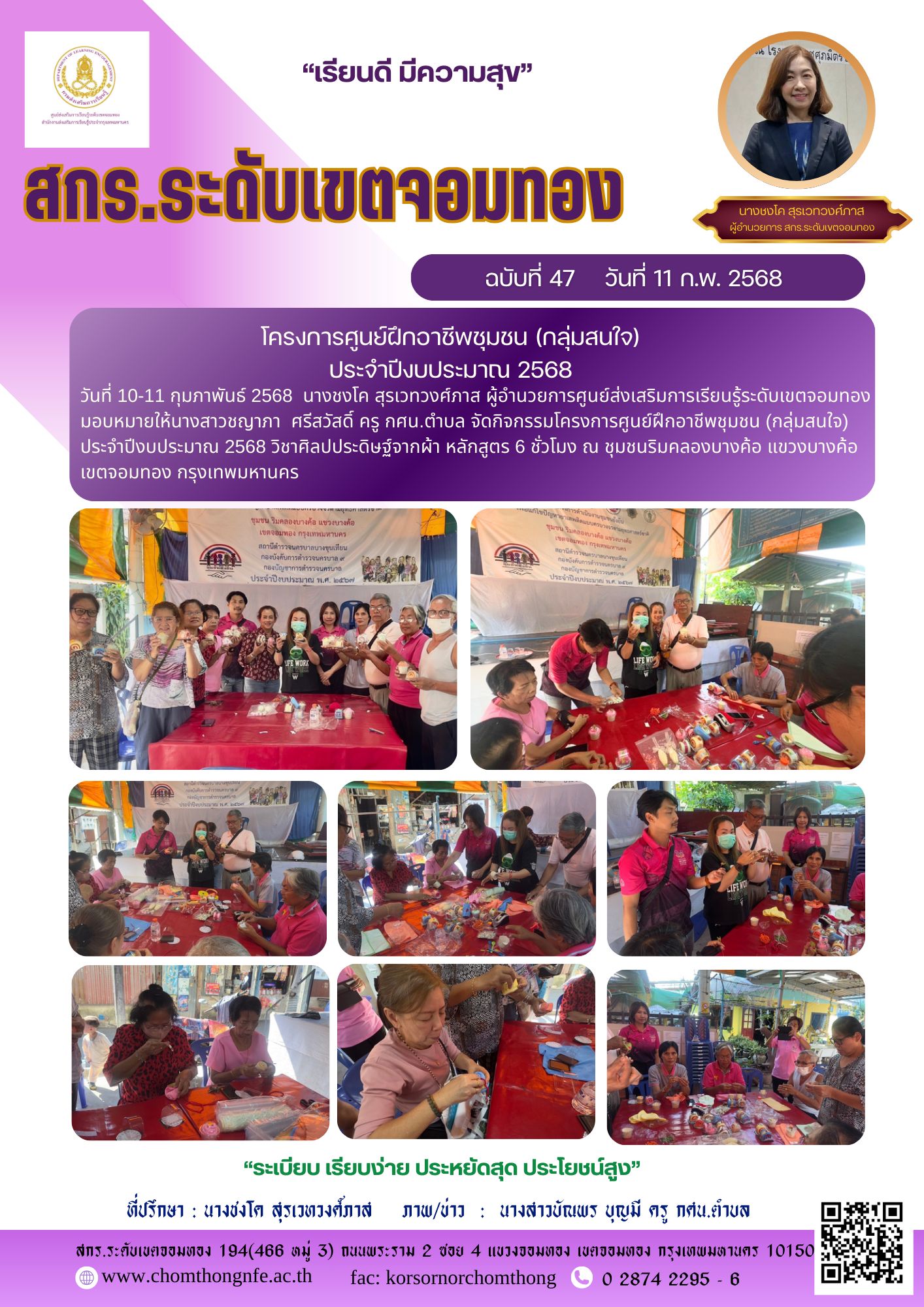 10-11 กุมภาพันธ์ 2568 นางชงโค สุรเวทวงศ์ภาส ผู้อำนวยการศูนย์ส่งเสริมการเรียนรู้ระดับเขตจอมทอง มอบหมายให้นางสาวชญาภา ศรีสวัสดิ์ ครู กศน.ตำบล จัดกิจกรรมโครงการศูนย์ฝึกอาชีพชุมชน (กลุ่มสนใจ) ประจำปีงบประมาณ 2568 วิชาศิลปประดิษฐ์จากผ้า หลักสูตร 6 ชั่วโมง ณ ชุมชนริมคลองบางค้อ แขวงบางค้อ เขตจอมทอง กรุงเทพมหานคร