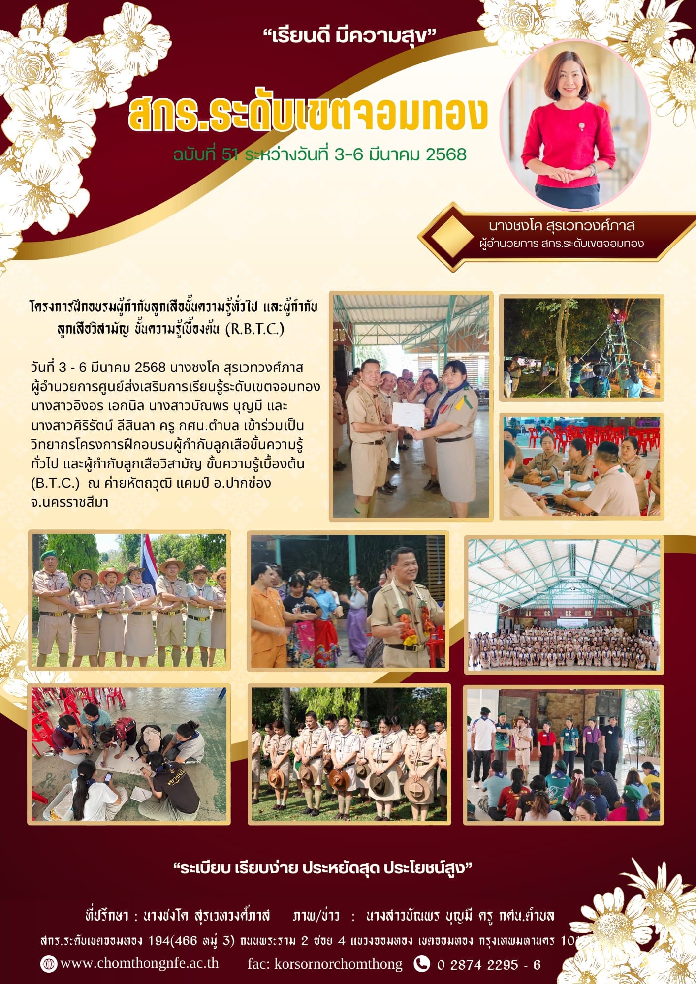3 - 6 มีนาคม 2568 นางชงโค สุรเวทวงศ์ภาส ผู้อำนวยการศูนย์ส่งเสริมการเรียนรู้ระดับเขตจอมทอง นางสาวอิงอร เอกนิล นางสาวบัณพร บุญมี และนางสาวศิริรัตน์ ลีสินลา ครู กศน.ตำบล เข้าร่วมเป็นวิทยากรโครงการฝึกอบรมผู้กำกับลูกเสือขั้นความรู้ทั่วไป และผู้กำกับลูกเสือวิสามัญ ขั้นความรู้เบื้องต้น (B.T.C.) ณ ค่ายหัตถวุฒิ แคมป์ อ.ปากช่อง จ.นครราชสีมา