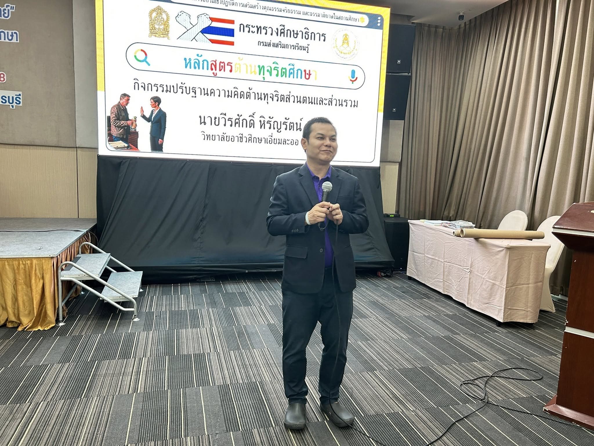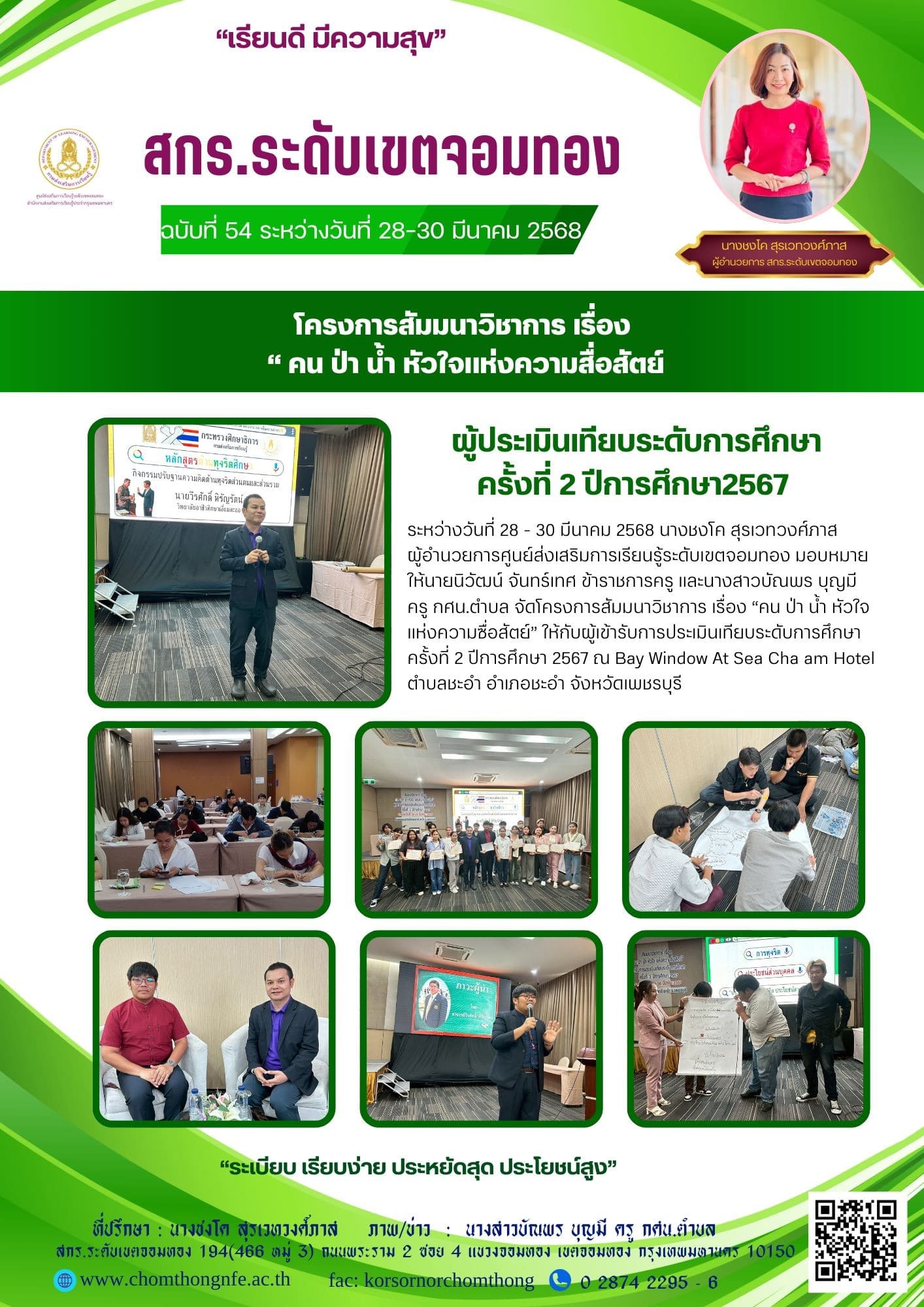 28 - 30 มีนาคม 2568 นางชงโค สุรเวทวงศ์ภาส ผู้อำนวยการศูนย์ส่งเสริมการเรียนรู้ระดับเขตจอมทอง มอบหมายให้นายนิวัฒน์ จันทร์เทศ ข้าราชการครู และนางสาวบัณพร บุญมี ครู กศน.ตำบล จัดโครงการสัมมนาวิชาการ เรื่อง “คน ป่า น้ำ หัวใจแห่งความซื่อสัตย์” ให้กับผู้เข้ารับการประเมินเทียบระดับการศึกษา ครั้งที่ 2 ปีการศึกษา 2567 ทั้งนี้ได้รับเกียรติจาก นายวีรศักดิ์ หิรัญรัตน์ คุณครูจากวิทยาลัยอาชีวศึกษาเอี่ยมละออ ณ Bay Window At Sea Cha am Hotel ตำบลชะอำ อำเภอชะอำ จังหวัดเพชรบุรี