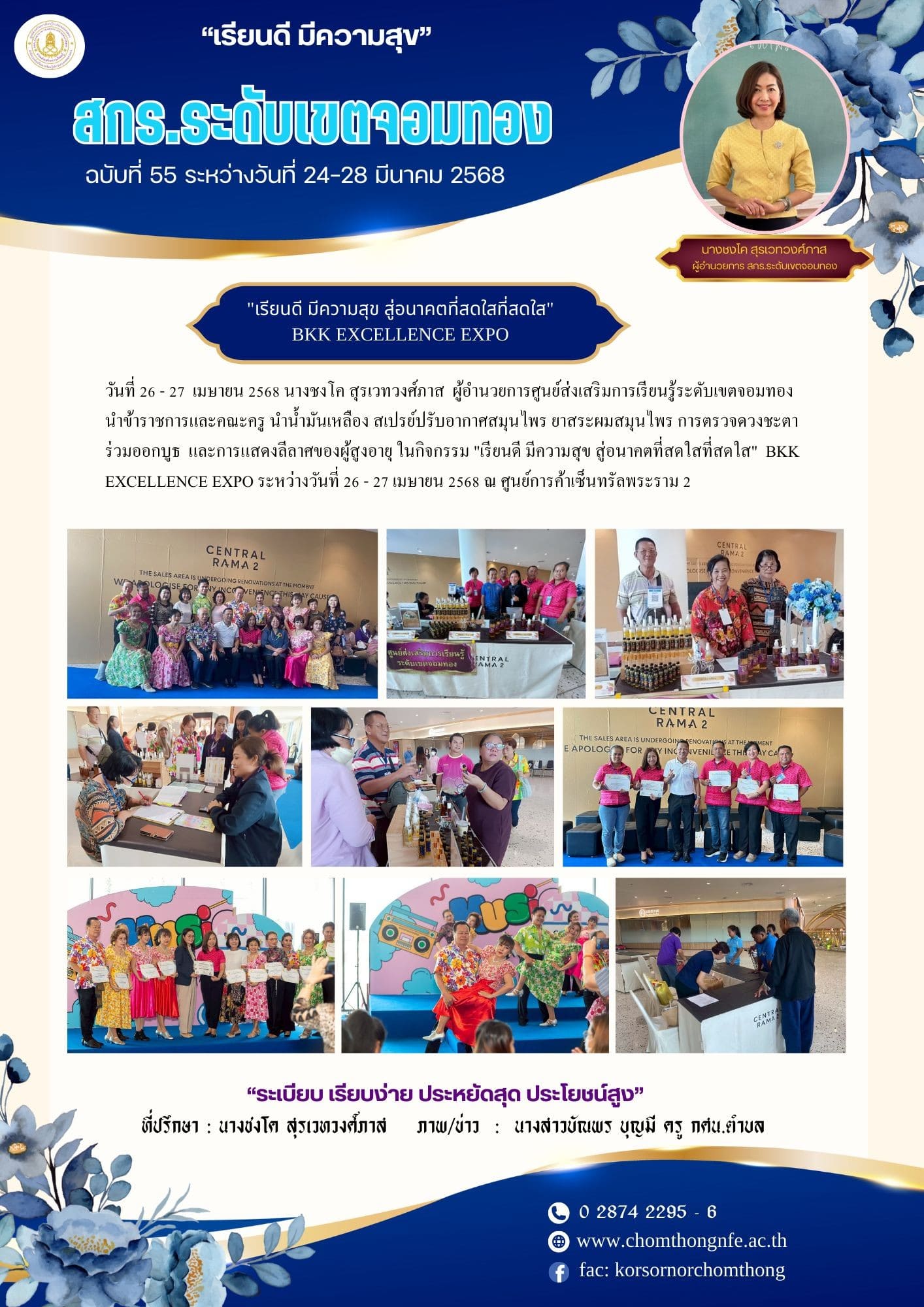 26 - 27 เมษายน 2568 นางชงโค สุรเวทวงศ์ภาส ผู้อำนวยการศูนย์ส่งเสริมการเรียนรู้ระดับเขตจอมทอง นำข้าราชการและคณะครู นำน้ำมันเหลือง สเปรย์ปรับอากาศสมุนไพร ยาสระผมสมุนไพร การตรวจดวงชะตาร่วมออกบูธ และการแสดงลีลาศของผู้สูงอายุ ในกิจกรรม "เรียนดี มีความสุข สู่อนาคตที่สดใสที่สดใส" BKK EXCELLENCE EXPOระหว่างณ ศูนย์การค้าเซ็นทรัลพระราม 2 กรุงเทพมหานคร