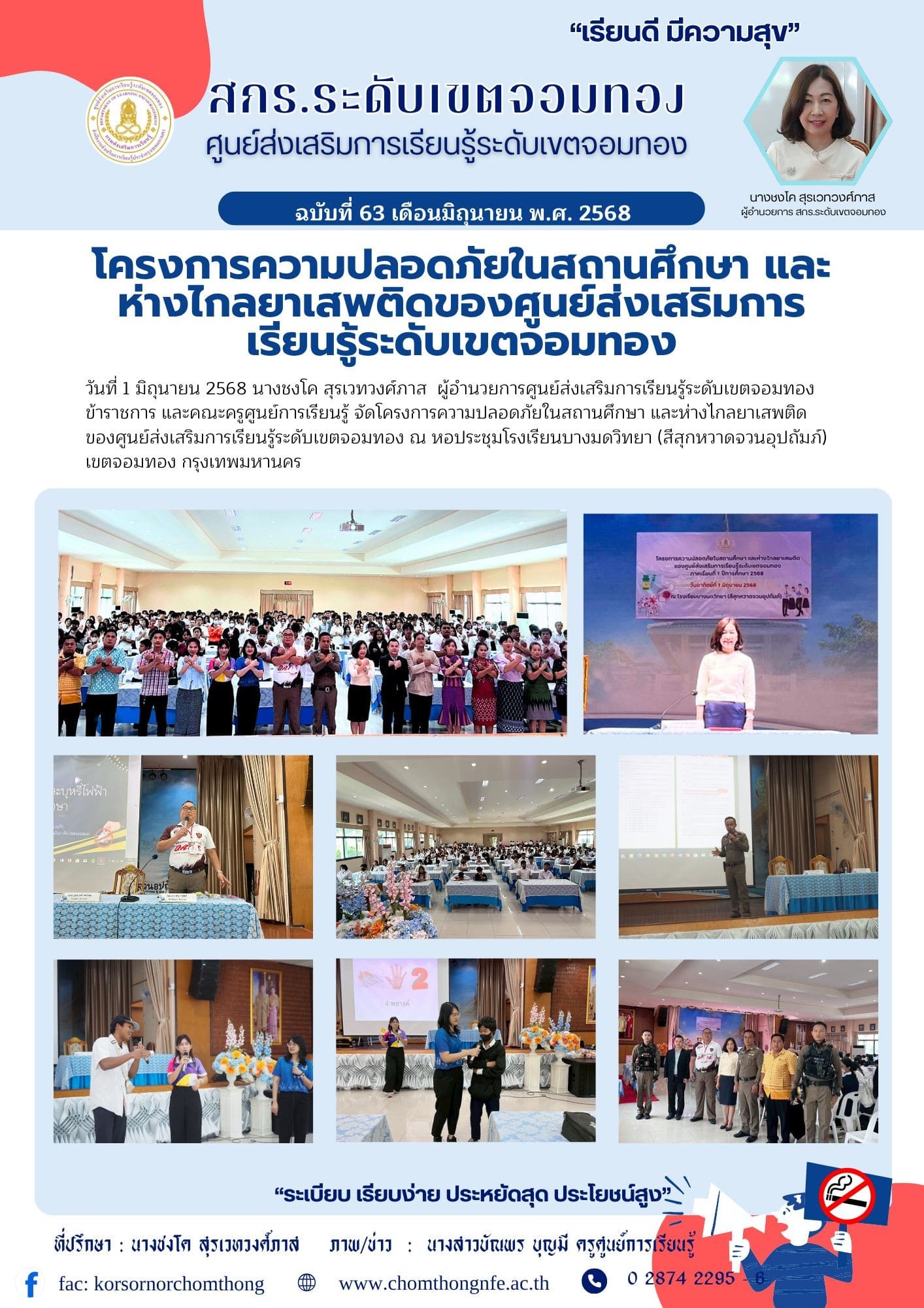 1 มิถุนายน 2568 นางชงโค สุรเวทวงศ์ภาส ผู้อำนวยการศูนย์ส่งเสริมการเรียนรู้ระดับเขตจอมทอง ข้าราชการ และคณะครูศูนย์การเรียนรู้ จัดโครงการความปลอดภัยในสถานศึกษา และห่างไกลยาเสพติด ของศูนย์ส่งเสริมการเรียนรู้ระดับเขตจอมทอง ณ หอประชุมโรงเรียนบางมดวิทยา (สีสุกหวาดจวนอุปถัมภ์) เขตจอมทอง กรุงเทพมหานคร