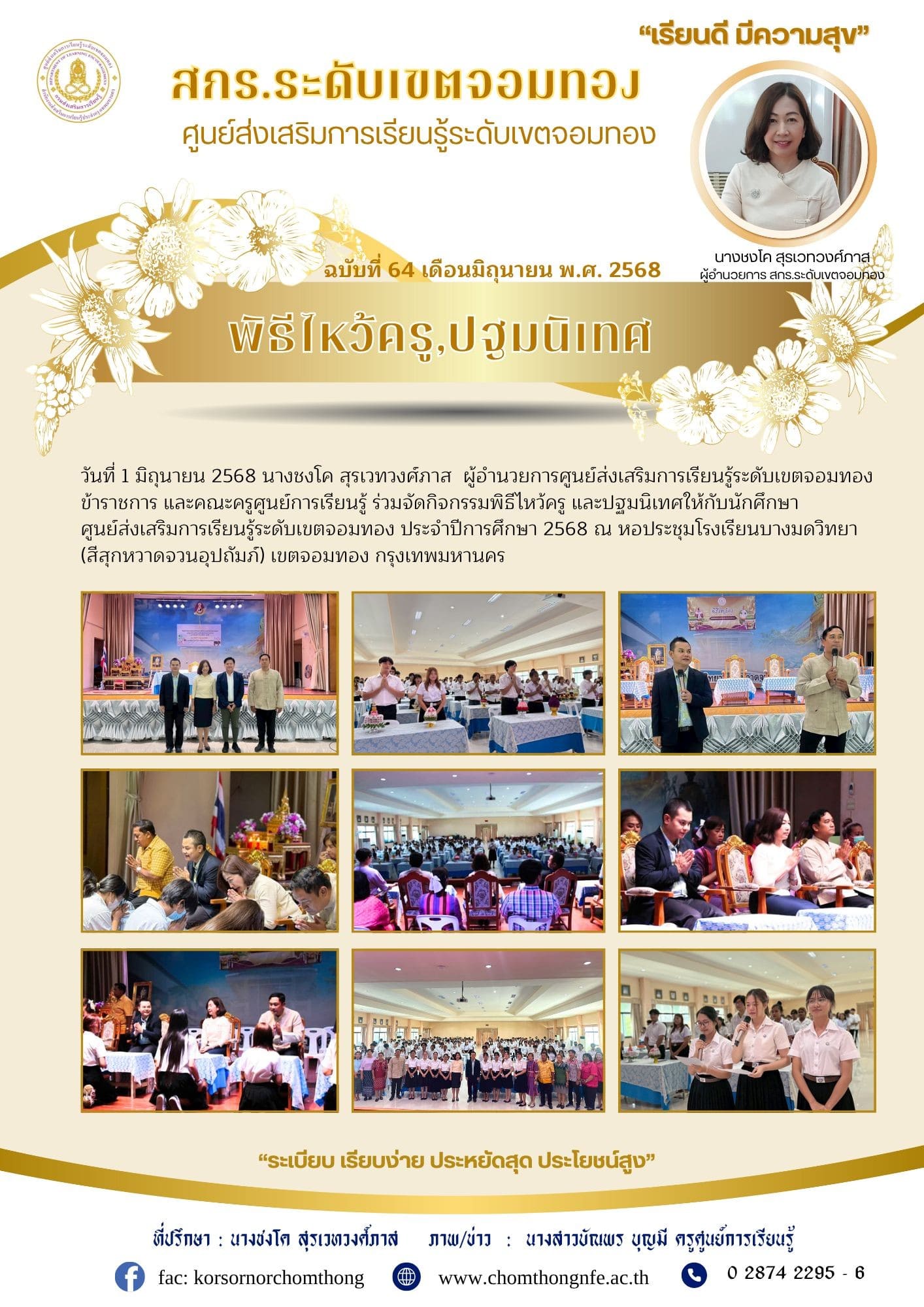 1 มิถุนายน 2568 นางชงโค สุรเวทวงศ์ภาส ผู้อำนวยการศูนย์ส่งเสริมการเรียนรู้ระดับเขตจอมทอง ข้าราชการ และคณะครูศูนย์การเรียนรู้ ร่วมจัดกิจกรรมพิธีไหว้ครู และปฐมนิเทศให้กับนักศึกษาศูนย์ส่งเสริมการเรียนรู้ระดับเขตจอมทอง ประจำปีการศึกษา 2568 ณ หอประชุมโรงเรียนบางมดวิทยา (สีสุกหวาดจวนอุปถัมภ์) เขตจอมทอง กรุงเทพมหานคร
