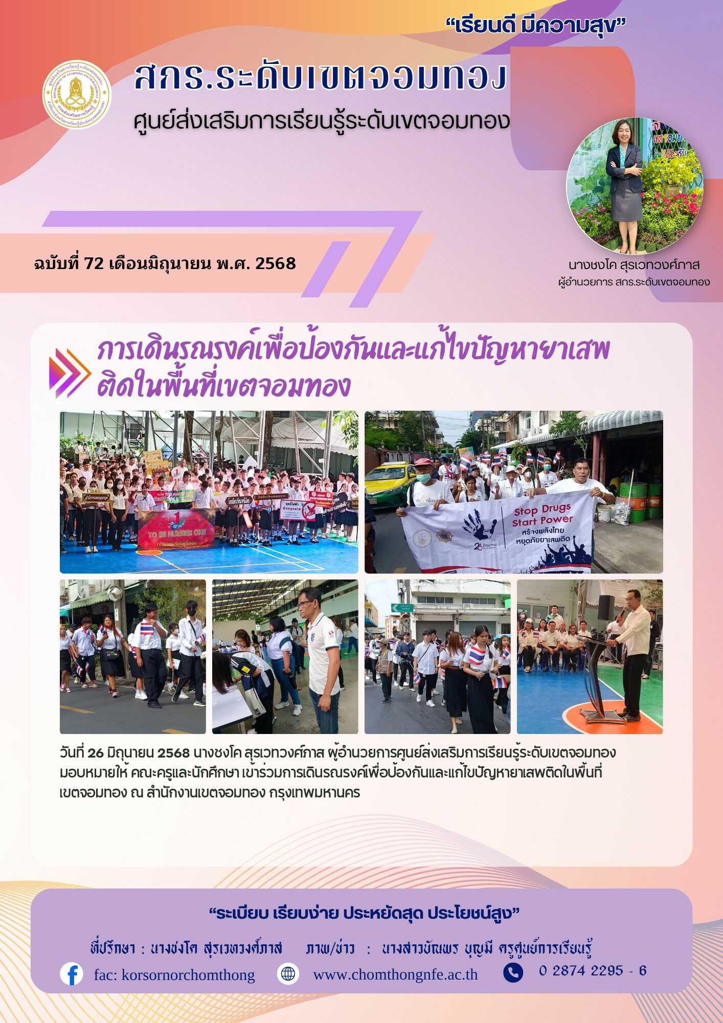26 มิถุนายน 2568 นางชงโค สุรเวทวงศ์ภาส ผู้อำนวยการศูนย์ส่งเสริมการเรียนรู้ระดับเขตจอมทอง มอบหมายให้ คณะครูและนักศึกษา เข้าร่วมการเดินรณรงค์เพื่อป้องกันและแก้ไขปัญหายาเสพติดในพื้นที่เขตจอมทอง ณ สำนักงานเขตจอมทอง กรุงเทพมหานคร