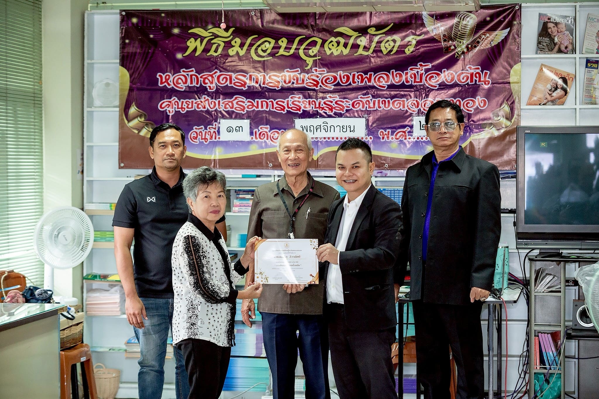 13 พฤศจิกายน 2568 นายนิวัฒน์ จันทร์เทศ ครูชำนาญการ รักษาการในตำแหน่ง ผู้อำนวยการศูนย์ส่งเสริมการเรียนรู้ระดับเขตจอมทอง ว่าที่ร้อยตรี อุทัย พลมารักษ์ ข้าราชการครู และคณะครู จัดพิธีมอบวุฒิบัตรหลักสูตรการขับร้องเพลงเบื้องต้น โดยมี อาจารย์บัญชา ธูสรานนท์ (อ.เนื้อทอง) เป็นผู้ฝึกสอน และ นายประเสริฐ สกุลเอี่ยมไพบูลย์ ผู้อำนวยการโรงเรียนดวงวิภา เป็นผู้สนับสนุนโครงการ ณ ศูนย์ส่งเสริมการเรียนรู้ระดับเขตจอมทอง สำนักงานเขตจอมทอง กรุงเทพมหานคร
