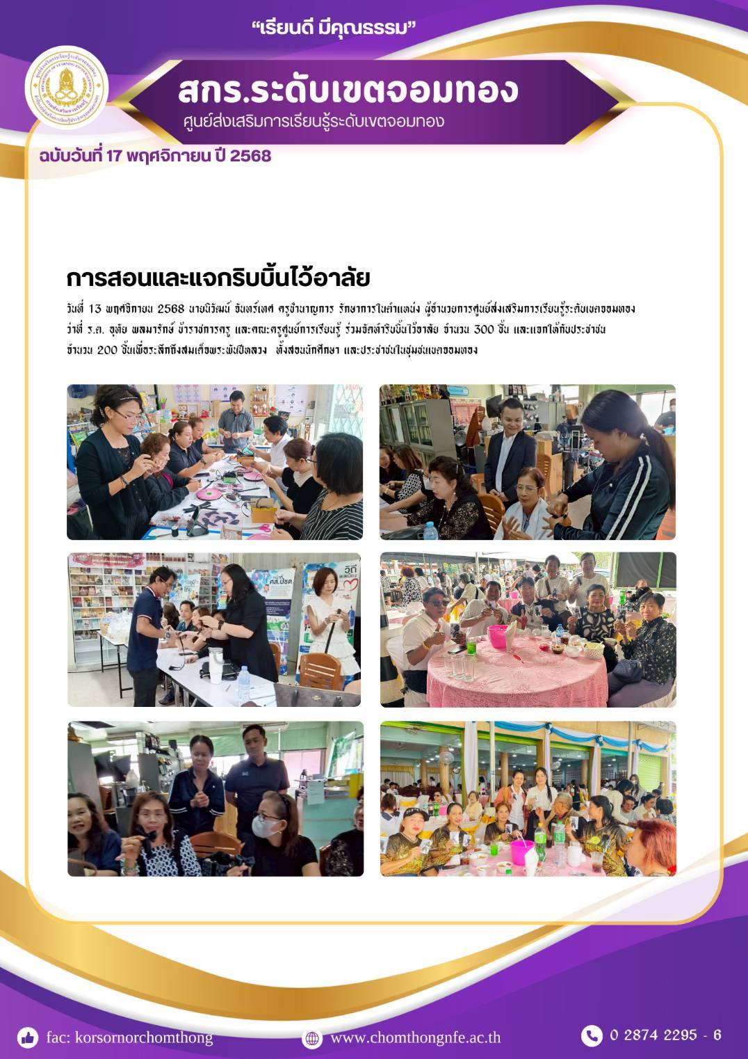13 พฤศจิกายน 2568 นายนิวัฒน์ จันทร์เทศ ครูชำนาญการ รักษาการในตำแหน่ง ผู้อำนวยการศูนย์ส่งเสริมการเรียนรู้ระดับเขตจอมทอง ว่าที่ ร.ต. อุทัย พลมารักษ์ ข้าราชการครู และคณะครูศูนย์การเรียนรู้ ร่วมจัดทำริบบ