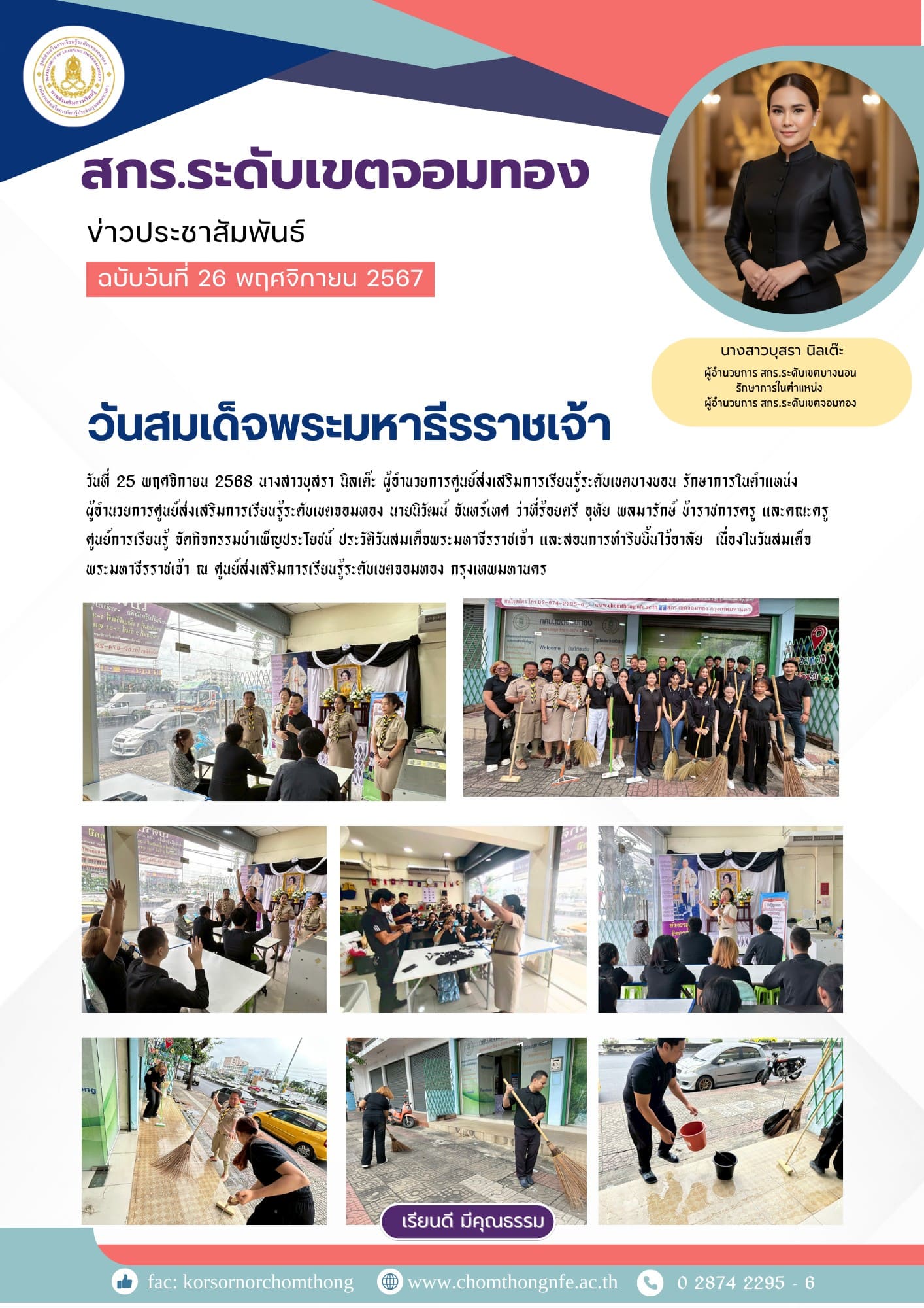 25 พฤศจิกายน 2568 นางสาวบุสรา นิลเต๊ะ ผู้อำนวยการศูนย์ส่งเสริมการเรียนรู้ระดับเขตบางบอน รักษาการในตำแหน่ง ผู้อำนวยการศูนย์ส่งเสริมการเรียนรู้ระดับเขตจอมทอง นายนิวัฒน์ จันทร์เทศ ว่าที่ร้อยตรี อุทัย พลมารักษ์ ข้าราชการครู และคณะครูศูนย์การเรียนรู้ จัดกิจกรรมบำเพ็ญประโยชน์ ประวัติวันสมเด็จพระมหาธีรราชเจ้า และสอนการทำริบบิ้นไว้อาลัย เนื่องในวันสมเด็จพระมหาธีรราชเจ้า ณ ศูนย์ส่งเสริมการเรียนรู้ระดับเขตจอมทอง กรุงเทพมหานคร