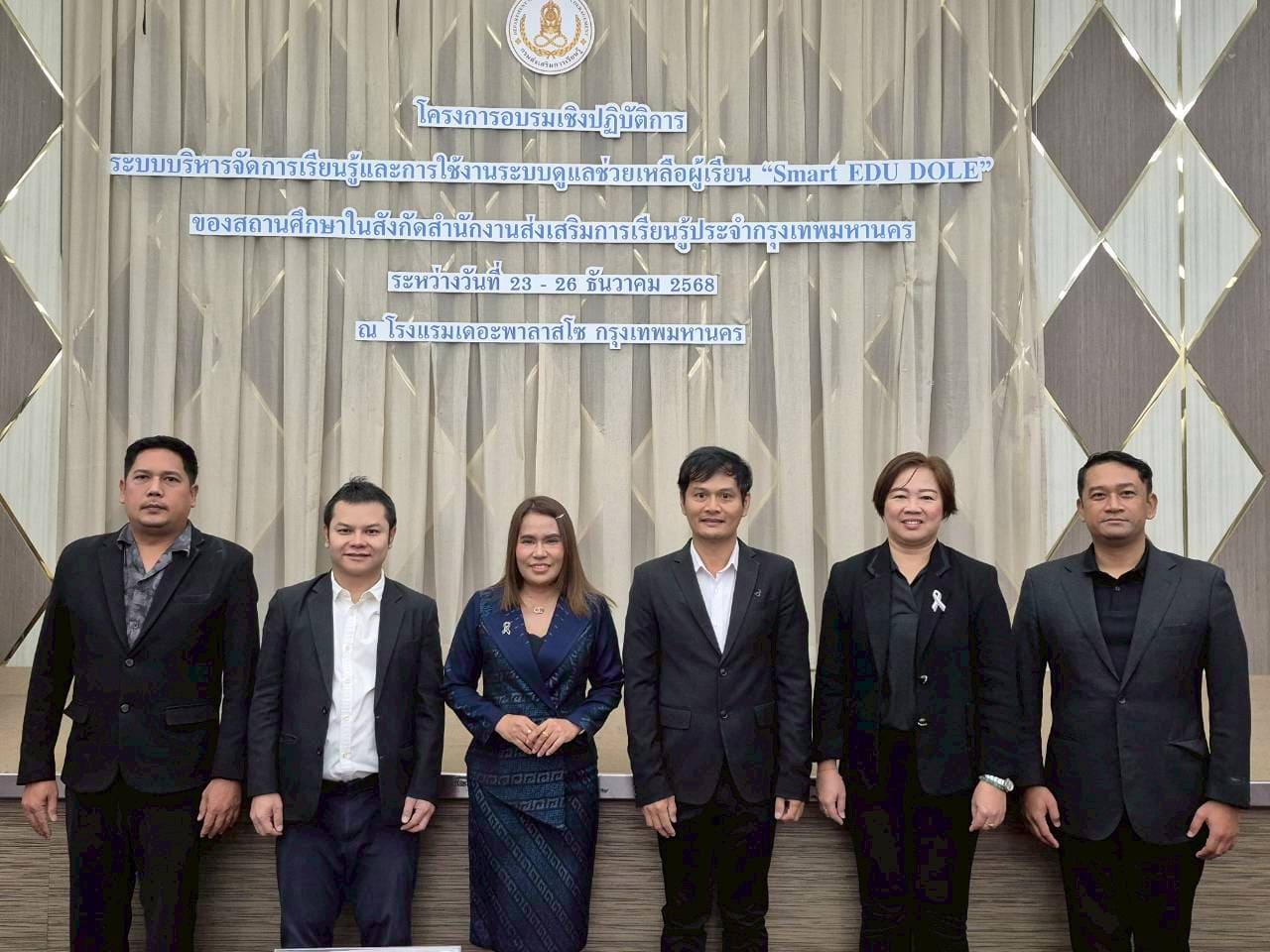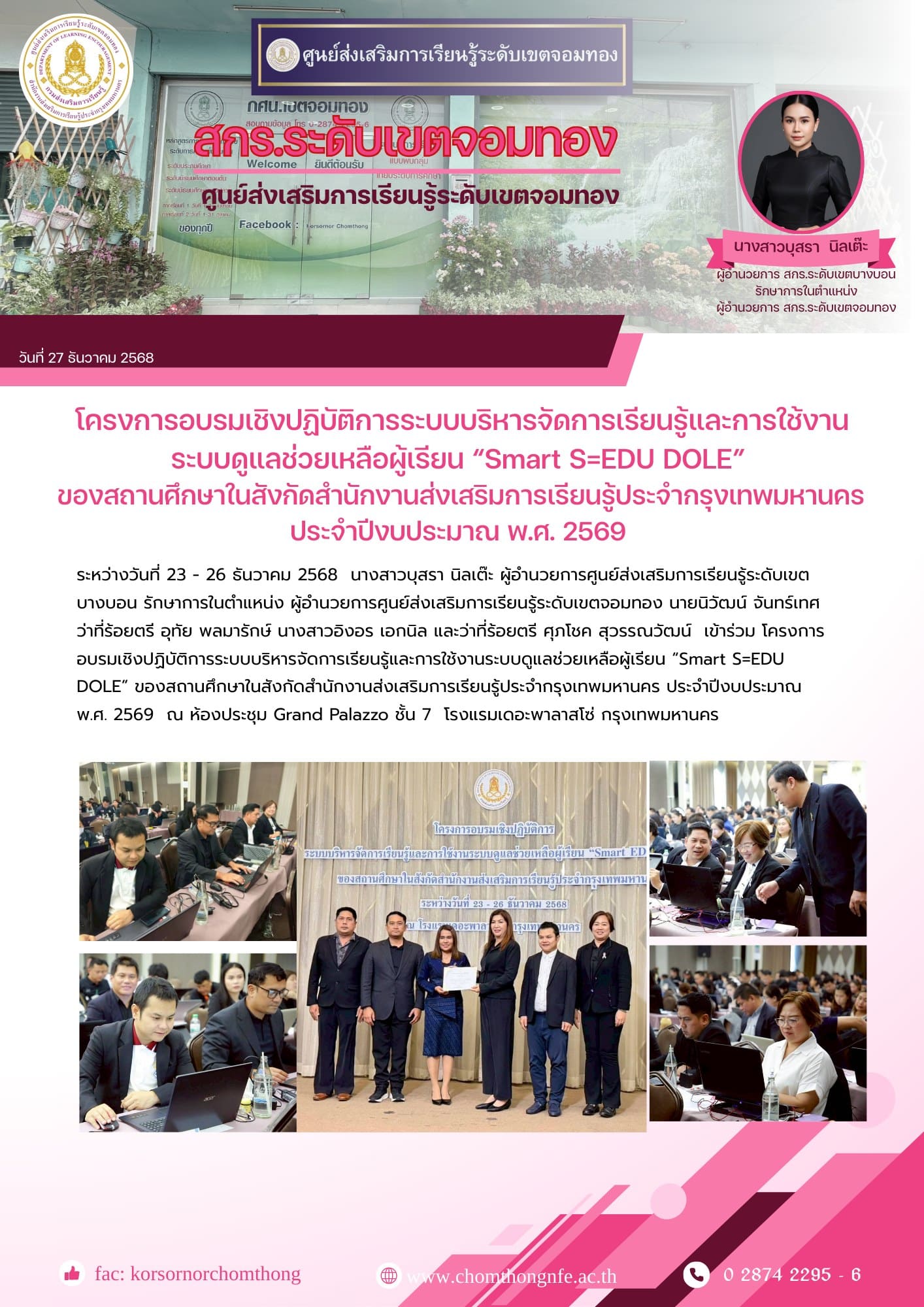 23 - 26 ธันวาคม 2568 นางสาวบุสรา นิลเต๊ะ ผู้อำนวยการศูนย์ส่งเสริมการเรียนรู้ระดับเขตบางบอน รักษาการในตำแหน่ง ผู้อำนวยการศูนย์ส่งเสริมการเรียนรู้ระดับเขตจอมทอง นายนิวัฒน์ จันทร์เทศ ว่าที่ร้อยตรี อุทัย พลมารักษ์ นางสาวอิงอร เอกนิล และว่าที่ร้อยตรี ศุภโชค สุวรรณวัฒน์ เข้าร่วม โครงการอบรมเชิงปฏิบัติการระบบบริหารจัดการเรียนรู้และการใช้งานระบบดูแลช่วยเหลือผู้เรียน “Smart S=EDU DOLE” ของสถานศึกษาในสังกัดสำนักงานส่งเสริมการเรียนรู้ประจำกรุงเทพมหานคร ประจำปีงบประมาณ พ.ศ. 2569 ณ ห้องประชุม Grand Palazzo ชั้น 7 โรงแรมเดอะพาลาสโซ่ กรุงเทพมหานคร