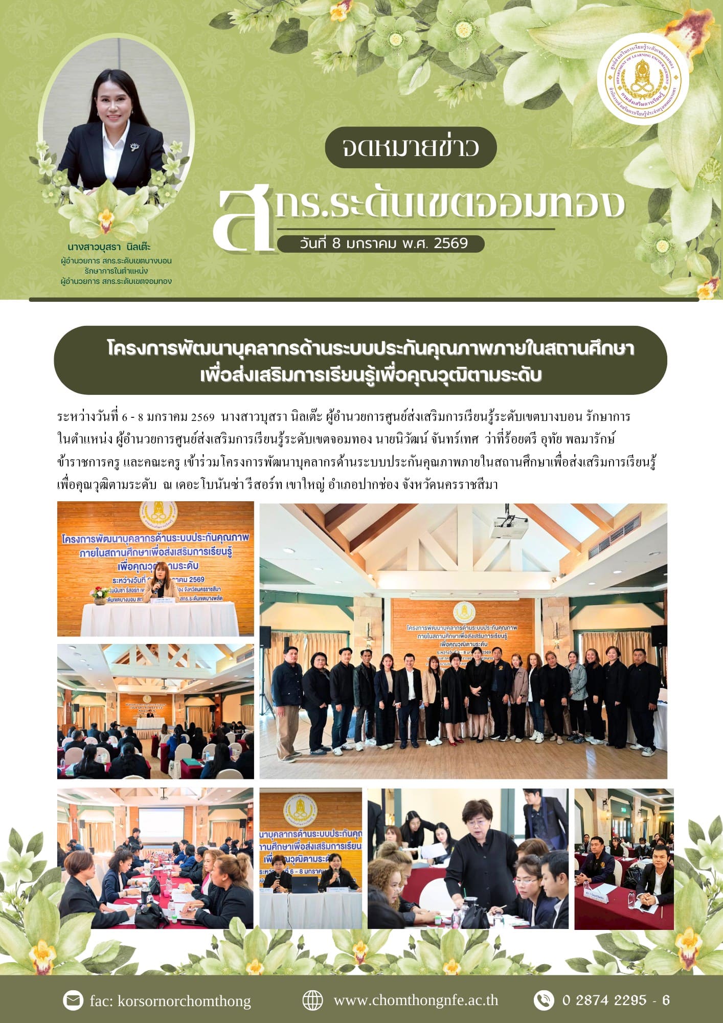 6 - 8 มกราคม 2569 นางสาวบุสรา นิลเต๊ะ ผู้อำนวยการศูนย์ส่งเสริมการเรียนรู้ระดับเขตบางบอน รักษาการในตำแหน่ง ผู้อำนวยการศูนย์ส่งเสริมการเรียนรู้ระดับเขตจอมทอง นายนิวัฒน์ จันทร์เทศ ว่าที่ร้อยตรี อุทัย พลมารักษ์ ข้าราชการครู และคณะครู เข้าร่วมโครงการพัฒนาบุคลากรด้านระบบประกันคุณภาพภายในสถานศึกษาเพื่อส่งเสริมการเรียนรู้เพื่อคุณวุฒิตามระดับ ณ เดอะโบนันซ่า รีสอร์ท เขาใหญ่ อำเภอปากช่อง จังหวัดนครราชสีมา