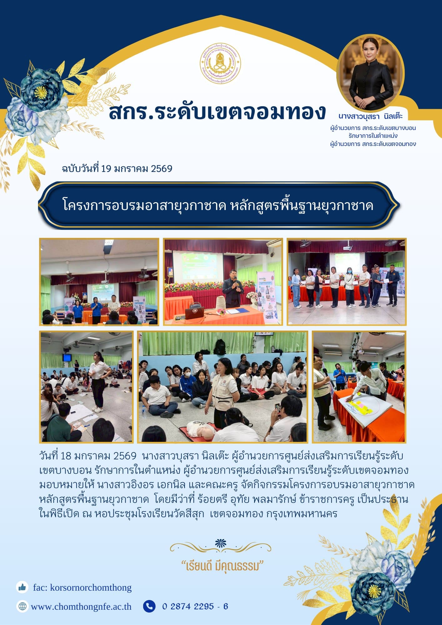 18 มกราคม 2569 นางสาวบุสรา นิลเต๊ะ ผู้อำนวยการศูนย์ส่งเสริมการเรียนรู้ระดับเขตบางบอน รักษาการในตำแหน่ง ผู้อำนวยการศูนย์ส่งเสริมการเรียนรู้ระดับเขตจอมทอง มอบหมายให้ นางสาวอิงอร เอกนิล และคณะครู จัดกิจกรรมโครงการอบรมอาสายุวกาชาด หลักสูตรพื้นฐานยุวกาชาด โดยมีว่าที่ ร้อยตรี อุทัย พลมารักษ์ ข้าราชการครู เป็นประธานในพิธีเปิด ณ หอประชุมโรงเรียนวัดสีสุก เขตจอมทอง กรุงเทพมหานคร