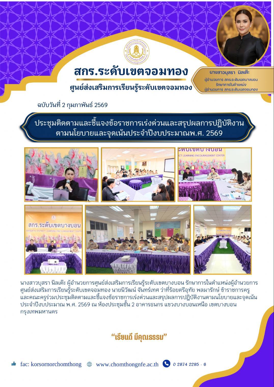 2 กุมภาพันธ์ 2569 นางสาวบุสรา นิลเต๊ะ ผู้อำนวยการศูนย์ส่งเสริมการเรียนรู้ระดับเขตบางบอน รักษาการในตำ