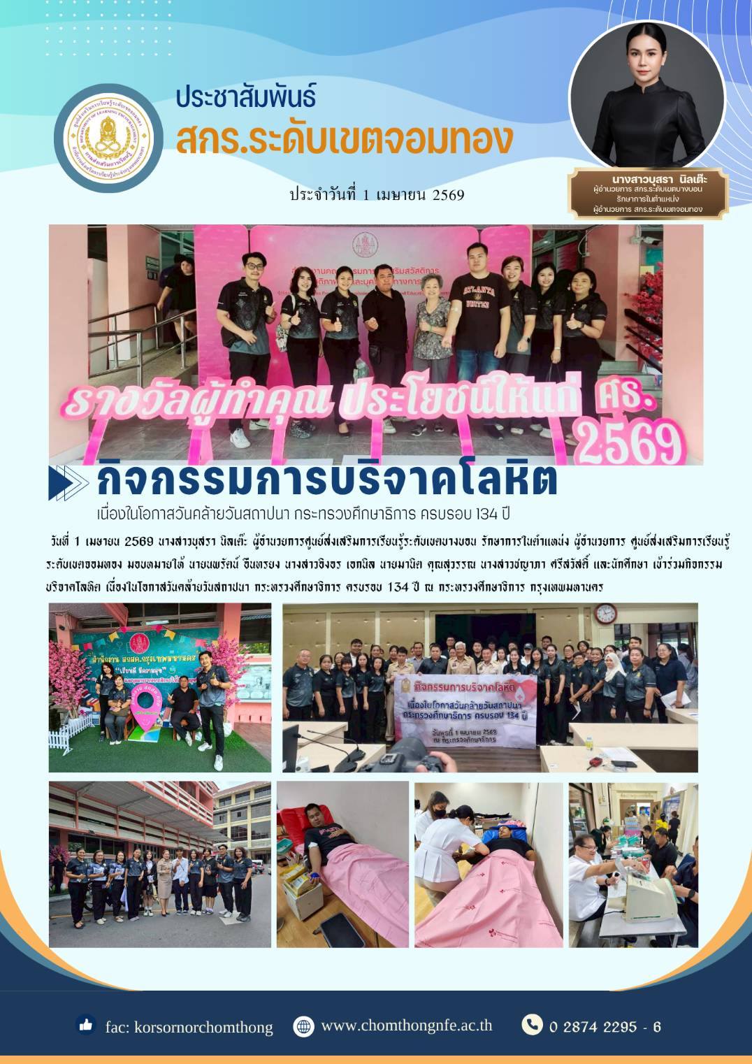 1 เมษายน 2569 นางสาวบุสรา นิลเต๊ะ ผู้อำนวยการศูนย์ส่งเสริมการเรียนรู้ระดับเขตบางบอน รักษาการในตำแหน่ง ผู้อำนวยการ ศูนย์ส่งเสริมการเรียนรู้ระดับเขตจอมทอง มอบหมายให้ นายนพรัตน์ อืนทรยง นางสาวอิงอร เอกนิล นายมานิต คุณสุวรรณ นางสาวชญาภา ศรีสวัสดิ์ และนักศึกษา เข้าร่วมกิจกรรมบริจาคโลหิต เนื่องในโอกาสวันคล้ายวันสถาปนา กระทรวงศึกษาธิการ ครบรอบ 134 ปี ณ กระทรวงศึกษาธิการ กรุงเทพมหานคร