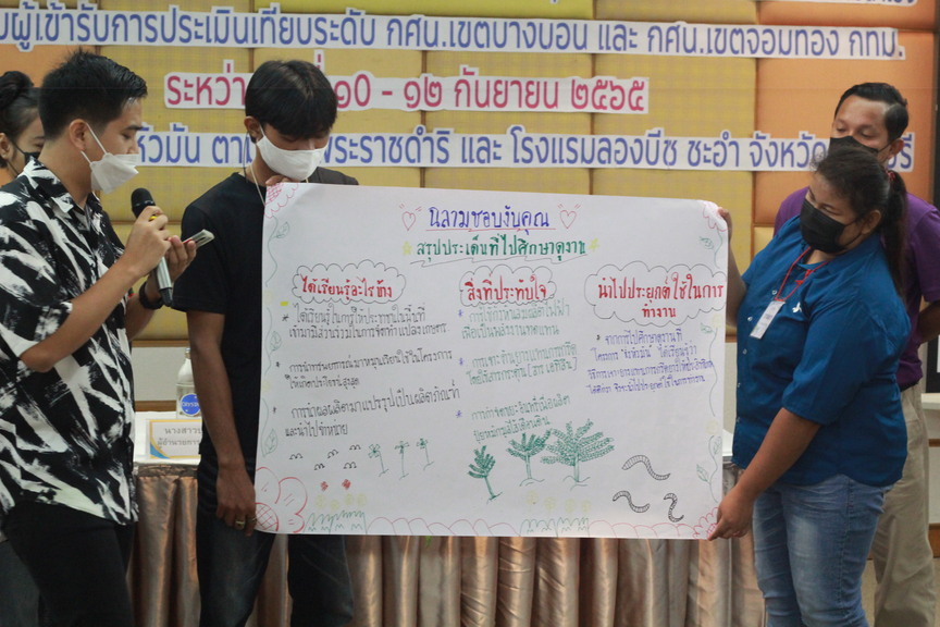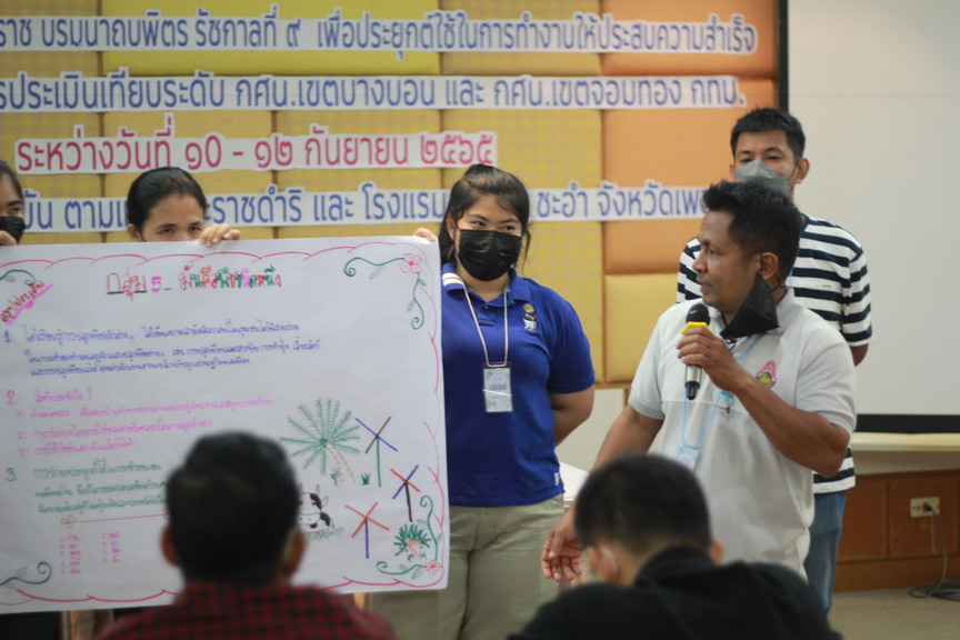 วันที่ 10-12 กันยายน 2565 (กิจกรรมวันที่ 11 กันยายน 2565) นางสาวบุสรา นิลเต๊ะ ผู้อำนวยการ กศน.เขตบางบอน รักษาการในตำแหน่ง ผู้อำนวยการ กศน.เขตจอมทอง พร้อมด้วยคณะครู กศน.เขตจอมทอง และกศน.เขตบางบอน จัดอบรมโครงการสัมมนาวิชาการผู้เข้ารับการประเมินเทียบระดับการศึกษา เรื่องการน้อมนำหลักการทรงงานของพระบาทสมเด็จพระบรมชนกาธิเบศรมหาภูมิพลอดุลยเดชมหาราชบรมนาถบพิตร รัชกาลที่ 9 เพื่อประยุกต์ใช้ในการทำงานให้ประสบความสำเร็จสำหรับผู้เข้ารับการประเมินเทียบระดับ กศน.เขตจอมทอง และกศน.เขตบางบอน กรุงเทพมหานคร. โดยมีผู้ประเมินเทียบระดับของ กศน.เขตจอมทอง และกศน.เขตบางบอน เข้าร่วมสัมมนาทั้งสิ้นจำนวน 56 คน ณ โครงการชั่งหัวมัน ตามแนวพระราชดำริ และ โรงแรมลองบีช ชะอำ จังหวัดเพชรบุรี