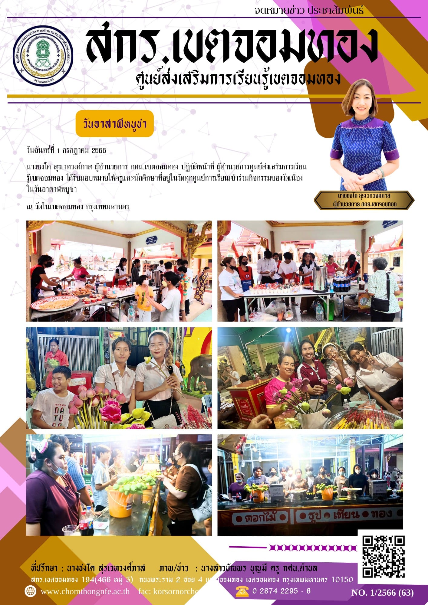 วันจันทร์์ที่ 1 กรกฏาคม 2566 นางชงโค สุรเวทวงศ์ภาส ผู้อำนวยการ กศน.เขตจอมทอง ปฏิบัติหน้าที่ ผู้อำนวย