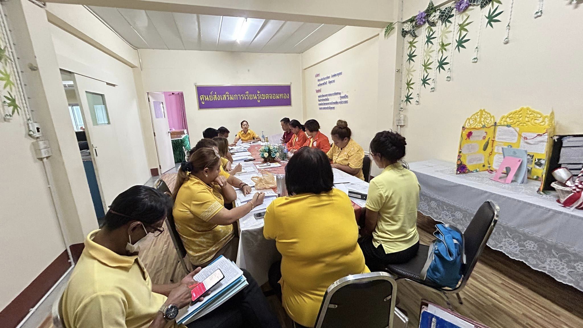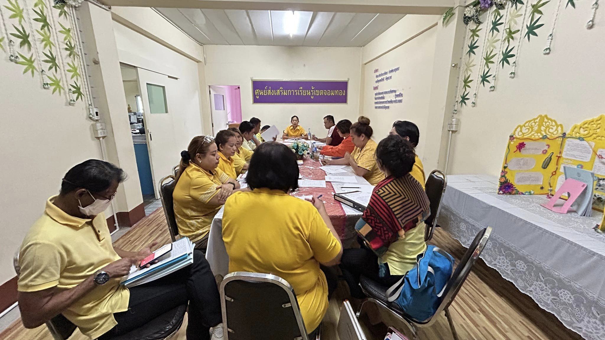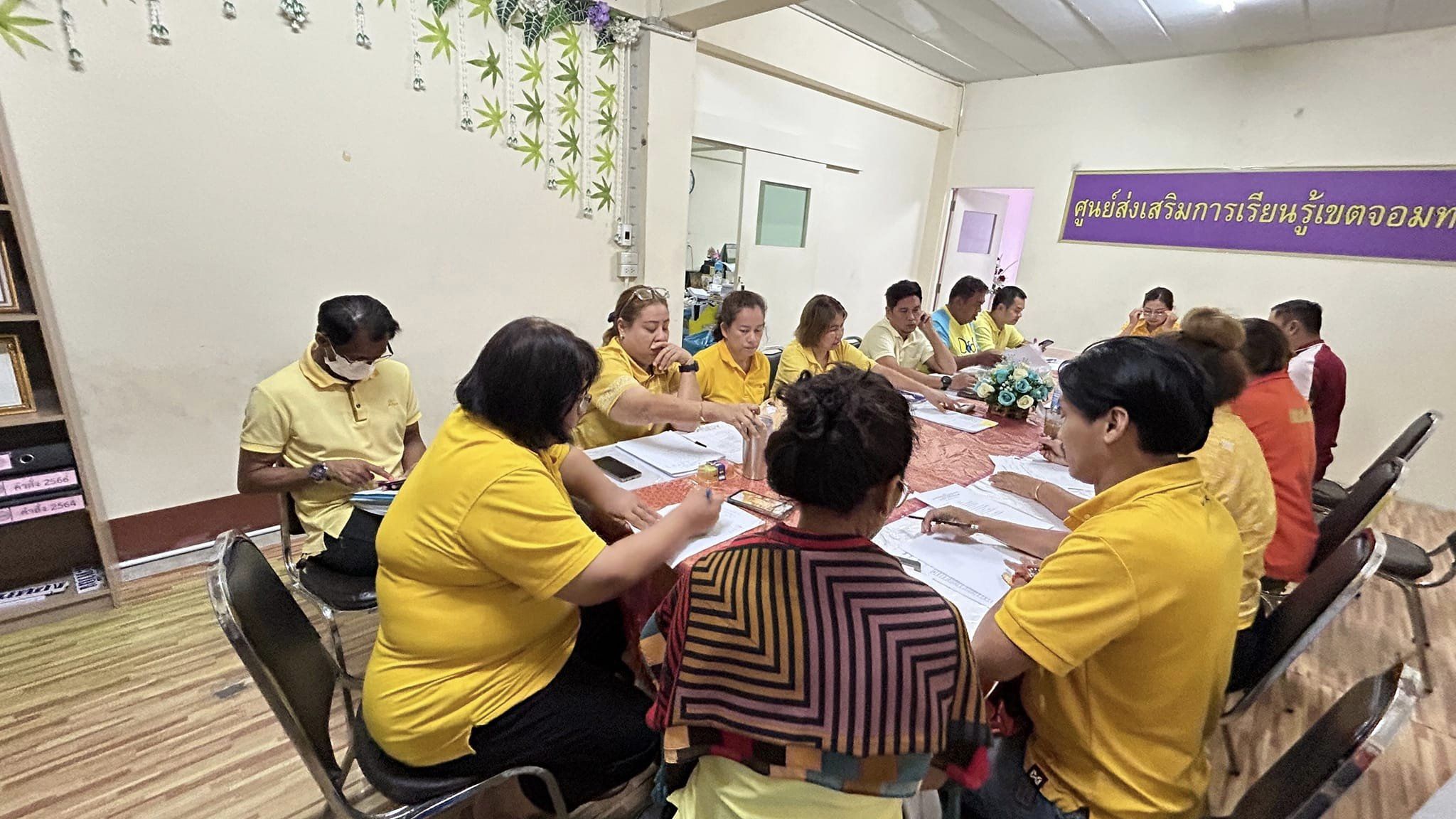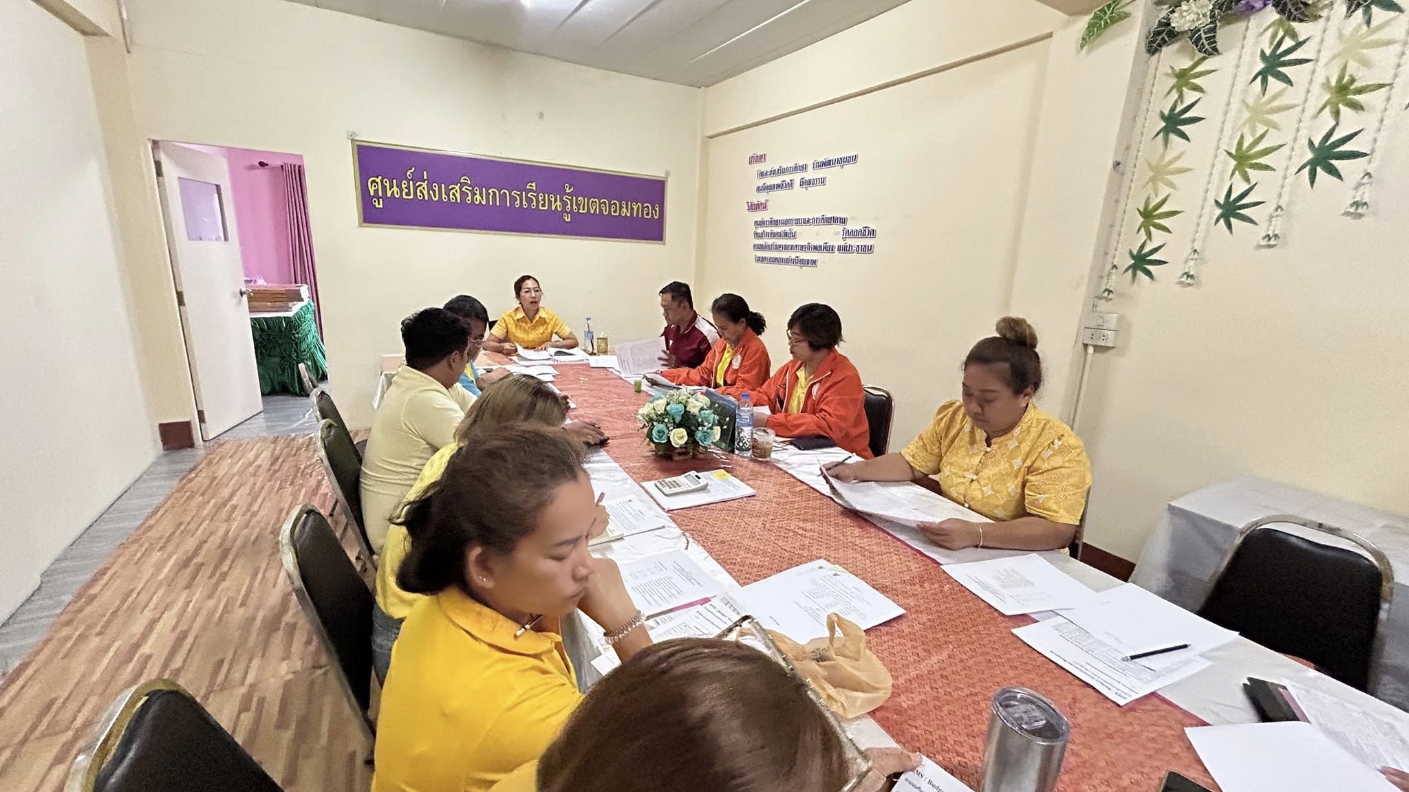 นางชงโค สุรเวทวงค์ภาส ผู้อำนวยการ กศน.เขตจอมทอง ปฏิบัติหน้าที่ผู้อำนวยการ สกร.ระดับเขตจอมทอง ข้าราชการ และคณะครู ดำเนินการประชุมติดตามการปฏิบัติงานและวางแผนการปฏิบัติงาน