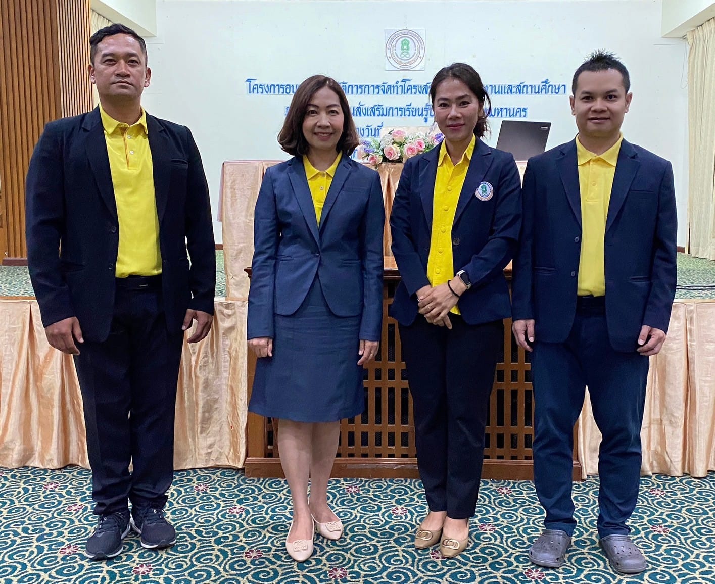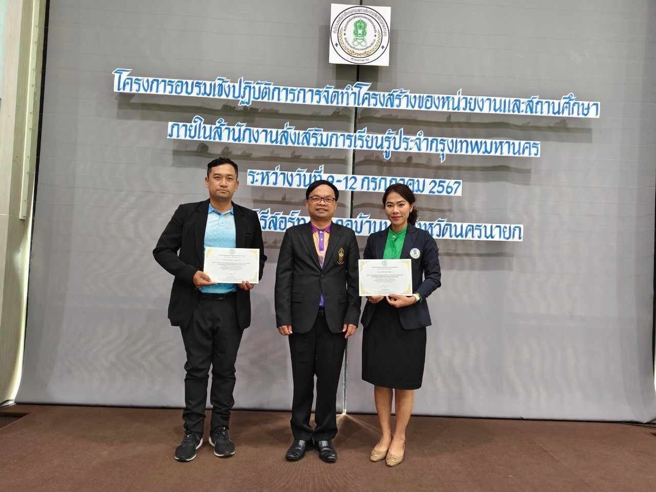 นางชงโค สุรเวทวงศ์ภาส ผู้อำนวยการ กศน.เขตจอมทอง ปฏิบัติหน้าที่ ผู้อำนวยการ สกร.ระดับเขตจอมทอง พร้อมด้วยนายนิวัฒน์ จันทร์เทศ ว่าที่ร้อยตรี อุทัย พลมารักษ์ ข้าราชการครู และนางสาวศิริรัตน์ ลีสินลา ครู กศน.ตำบล เข้าร่วมโครงการอบรมเชิงปฏิบัติการการจัดทำโครงสร้างของหน่วยงานและสถานศึกษาภายในสำนักงานส่งเสริมการเรียนรู้ประจำกรุงเทพมหานคร