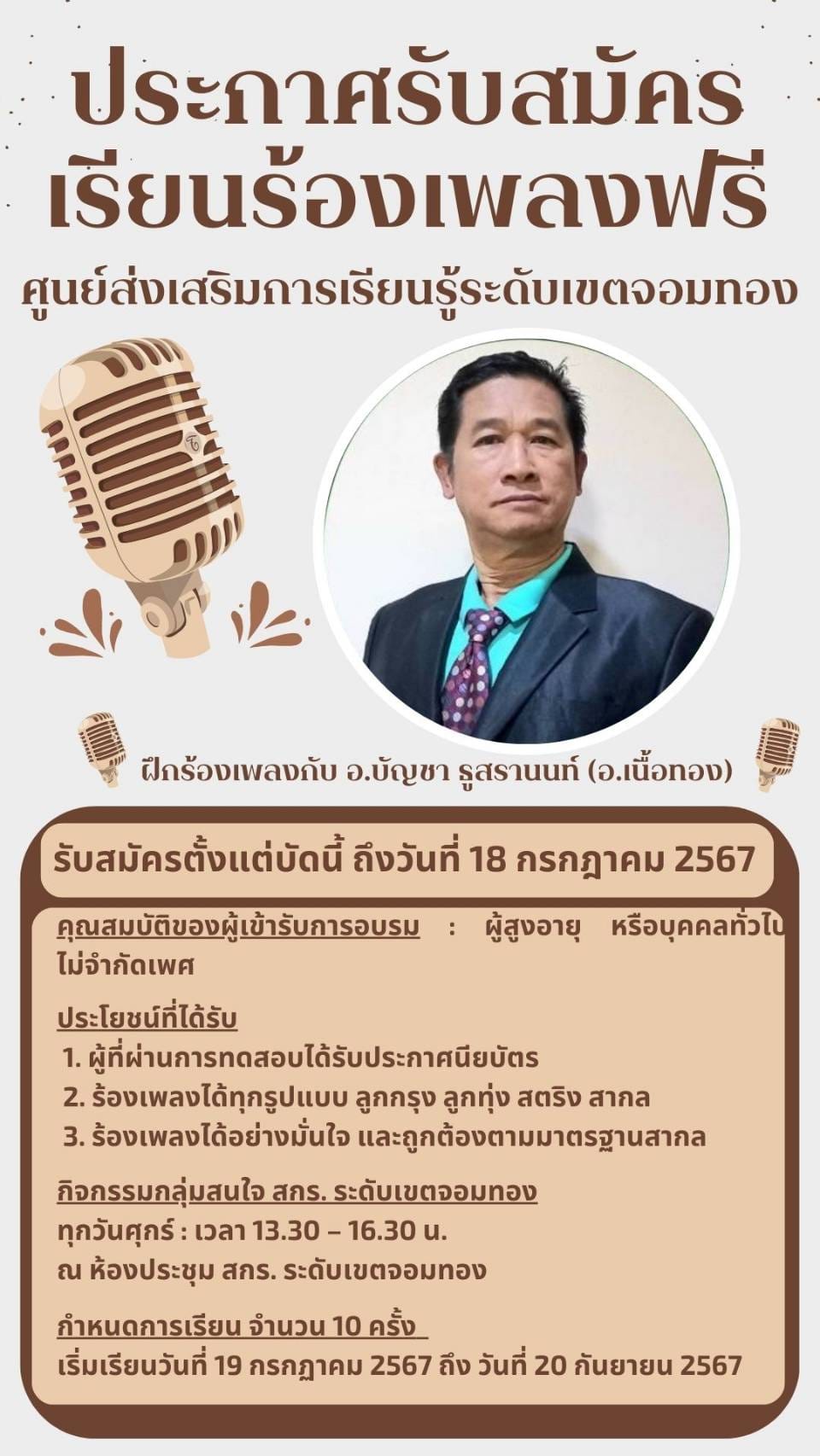 นางชงโค สุรเวทวงศ์ภาส ผู้อำนวยการ กศน.เขตจอมทอง ปฏิบัติหน้าที่ ผู้อำนวยการ สกร.ระดับเขตจอมทอง เปิดกลุ่มสนใจด้านการร้องเพลง โดยมีอาจารย์บัญชา ธูสรานนท์ (อ. เนื้อทอง) เป็นผู้ฝึกสอน
