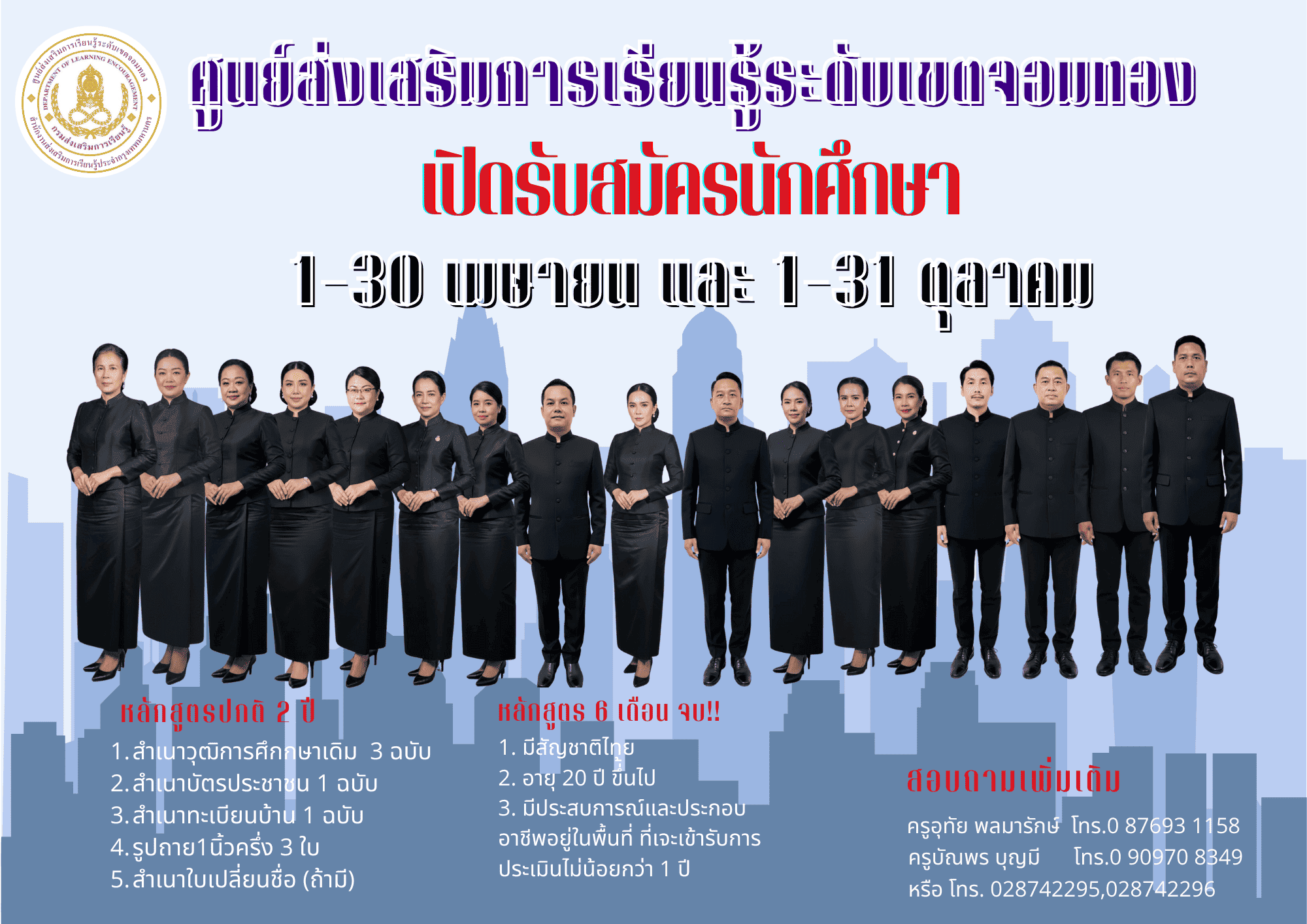 ศูนย์ส่งเสริมการเรียนรู้ระดับเขตจอมทอง เปิดรับสมัครนักศึกษาสำหรับผู้สนใจเรียน ระดับประถมศึกษา มัธยมศึกษาตอนต้น มัธยมศึกษาตอนปลาย เปิดรับสมัคร 2 ระยะ ระยะที่ 1 ระหว่างวันที่ 1 เมษายน ถึง 30 เมษายน และ ระยะที่ 2 ระหว่างวันที่ 1 ตุลาคม ถึง 31 ตุลาคม ของทุกปี