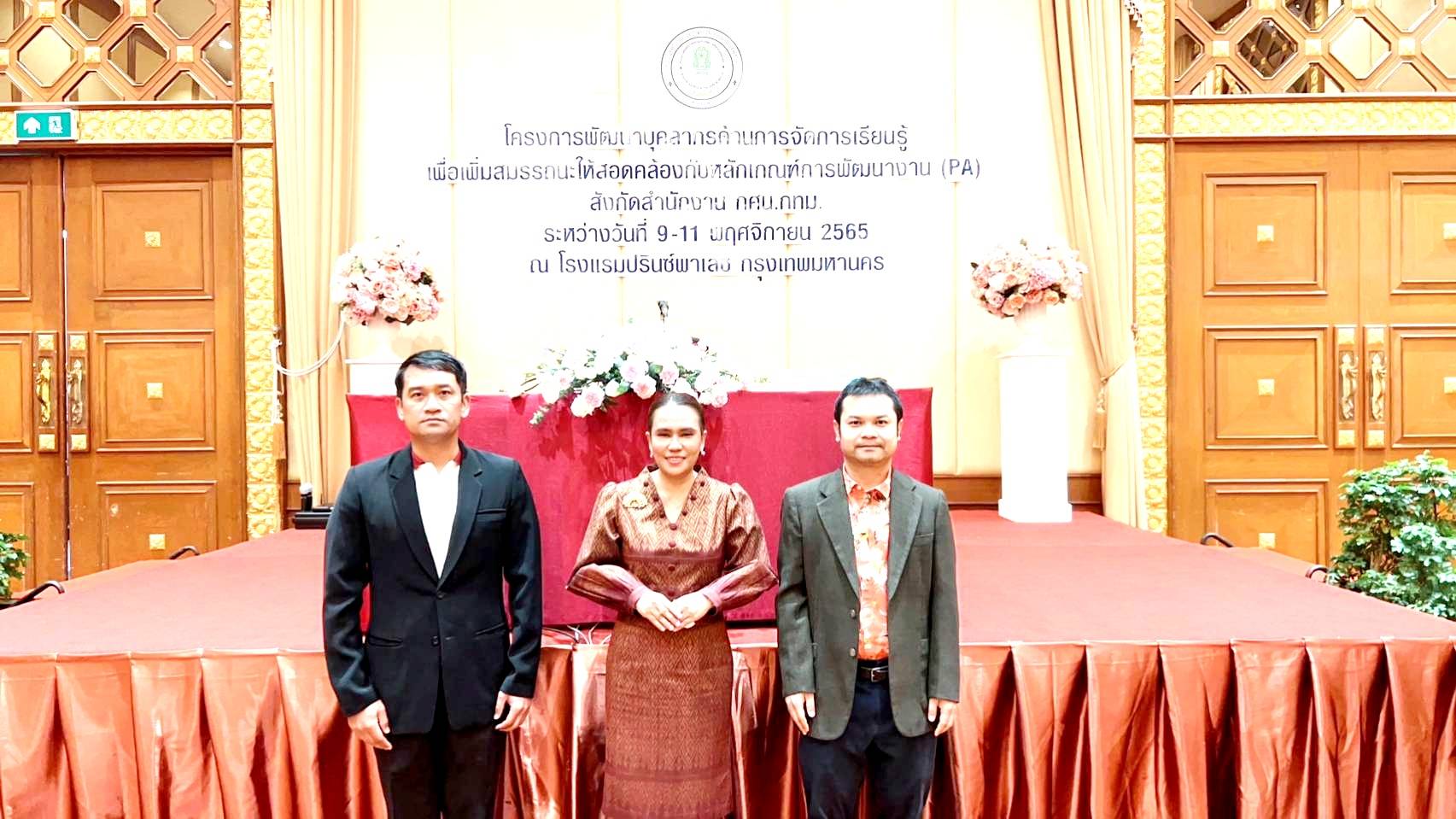 นางสาวบุสรา นิลเต๊ะ ผู้อำนวยการ กศน.เขตบางบอน รักษาการในตำแหน่ง ผู้อำนวยการ กศน.เขตจอมทอง นายนิวัฒน์ จันทร์เทศ และว่าที่ร้อยตรี อุทัย พลมารักษ์ ข้าราชการ เข้าร่วมโครงการพัฒนาบุคลากรด้านการจัดการเรียนรู้เพื่อเพิ่มสมรรถนะให้สอดคล้องกับหลักเกณฑ์การพัฒนางาน(PA) สังกัดสำนักงาน กศน.กทม. ระหว่างวันที่ 9-11 พฤศจิกายน 2565