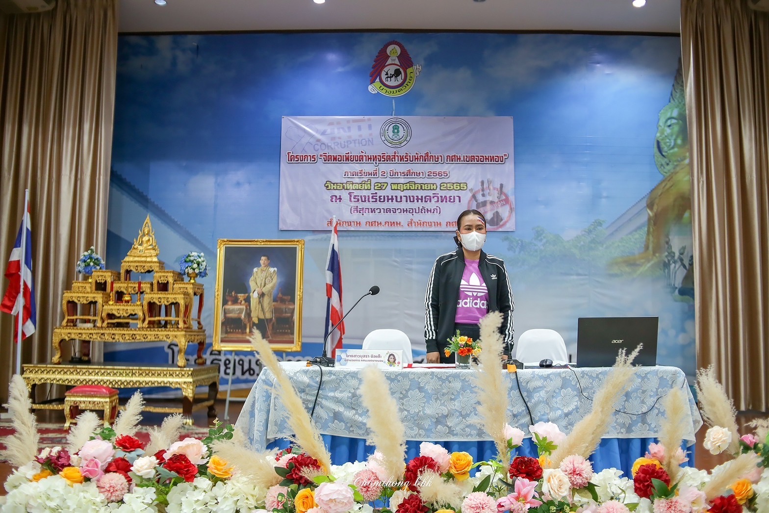วันอาทิตย์ที่ 27 พฤศจิกายน 2565 นางสาวบุสรา นิลเต๊ะ ผู้อำนวยการ กศน.เขตบางบอน รักษาการในตำแหน่ง ผู้อำนวยการ กศน.เขตจอมทอง ข้าราชการและคณะครู ร่วมกันจัดโครงการ " จิตพอเพียงต้านทุจริตสำ