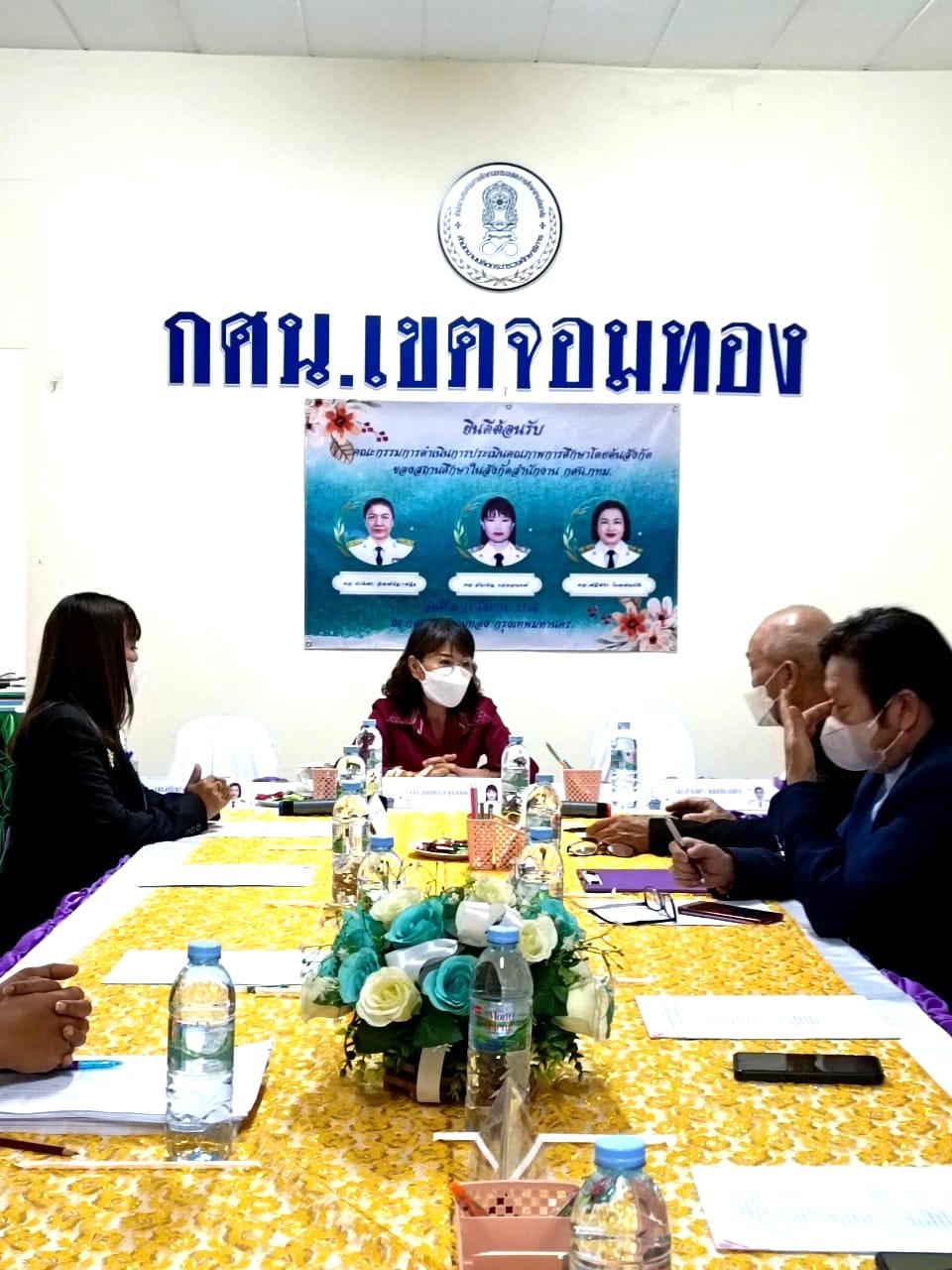 วันที่ 9 มีนาคม 2566 (วันแรกของการประเมินฯ) นางสาวบุสรา นิลเต๊ะ ผู้อำนวยการ กศน.เขตบางบอน รักษาการในตำแหน่ง ผู้อำนวยการ กศน.เขตจอมทอง ข้าราชการครู และคณะครู กศน.เขตจอมทอง เข้ารับการประเมินค