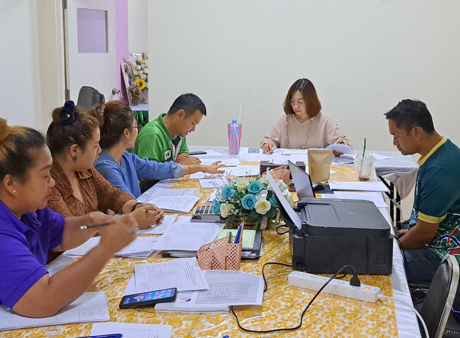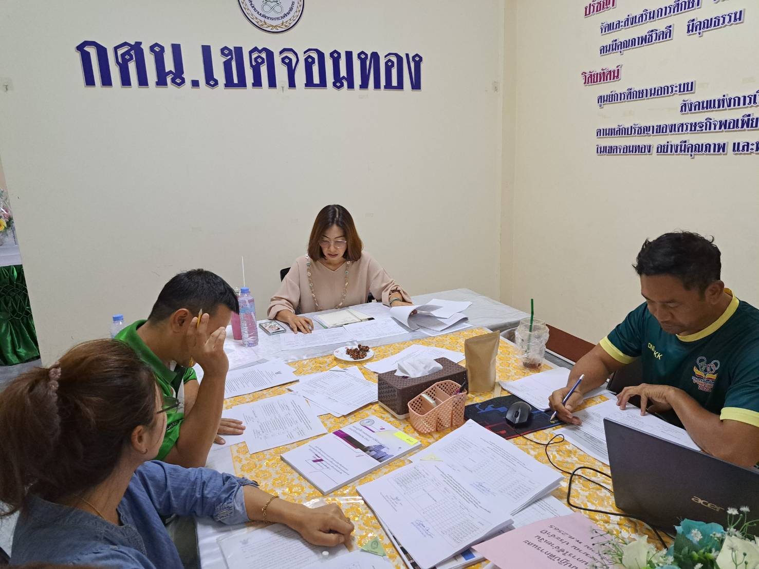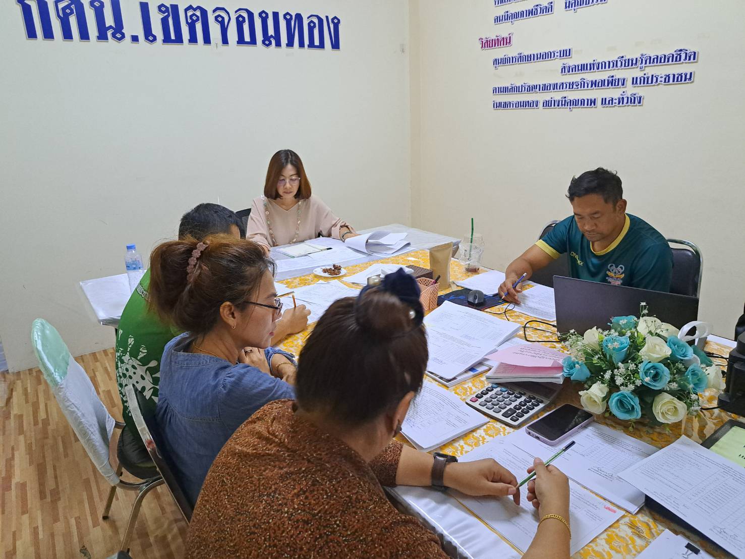 วันพฤหัสบดีที่ 27 เมษายน 2566 นางชงโค สุรเวทวงศ์ภาส ผู้อำนวยการ กศน.เขตจอมทอง ข้าราชการ และคณะครู กลุ่มแผนและการเงิน ประชุมสรุปผลการดำเนินงาน และการใช้จ่ายงบประมาณ ไตรมาส 1-2 รวมทั้งวางแผนการดำเนิน