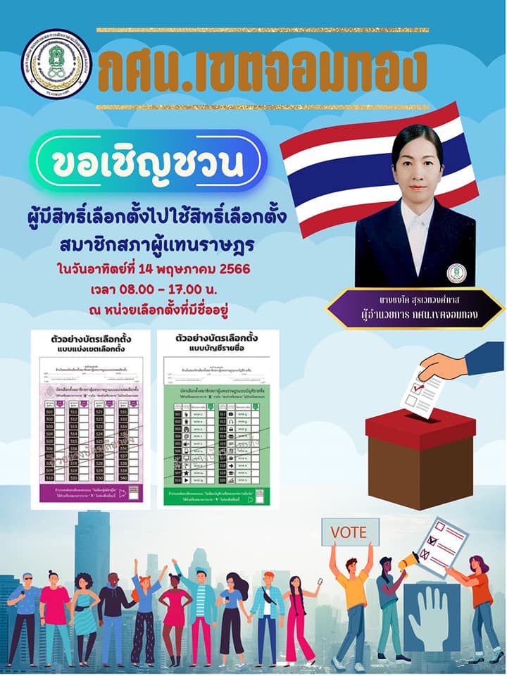 กศน.เขตจอมทองขอเชิญชวนผู้มีสิทธิ์เลือกตั้งไปใช้สิทธิ์เลือกตั้งสมาชิกสภาผู้แทนราษฎร ในวันอาทิตย์ที่ 14 พฤษภาคม 2566 ตั้งแต่เวลา 8.00 - 17.00 น. ณ หน่วยเลือกตั้งที่มีชื่ออยู่