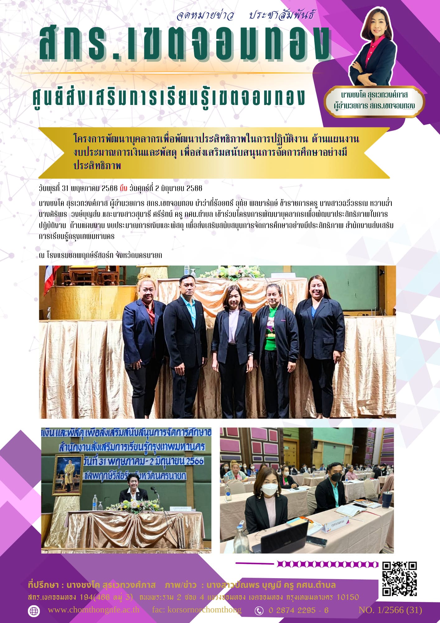 วันพุธที่ 31 พฤษภาคม 2566 ถึง วันศุกร์ที่ 2 มิถุนายน 2566 นางชงโค สุรเวทวงศ์ภาส ผู้อำนวยการ สกร.เขตจ