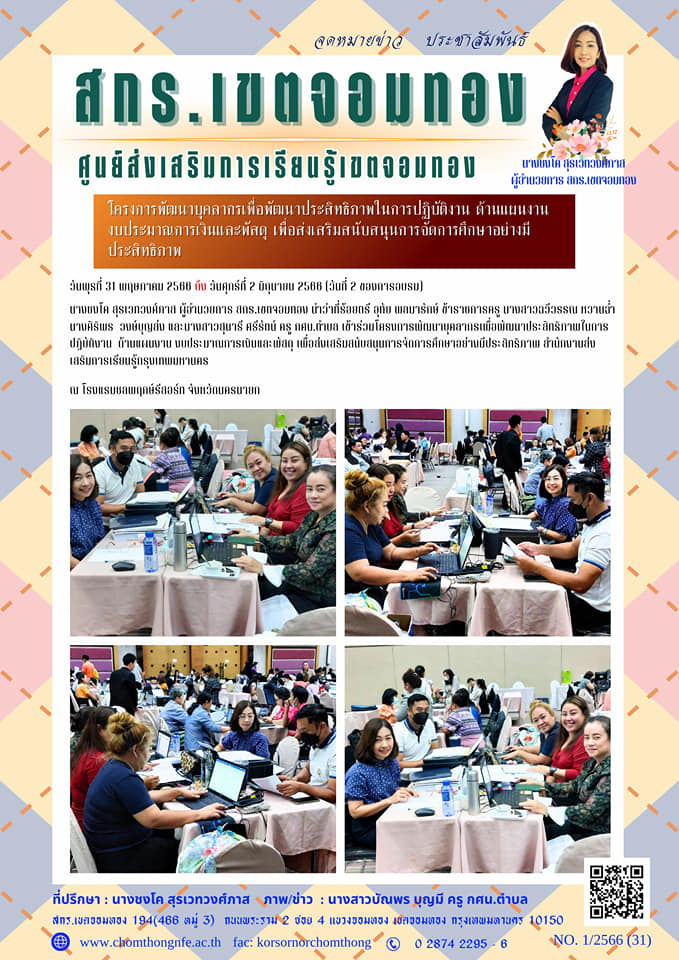 วันพุธที่ 31 พฤษภาคม 2566 ถึง วันศุกร์ที่ 2 มิถุนายน 2566 (วันที่ 2 ของการอบรม) นางชงโค สุรเวทวงศ์ภาส ผู้อำนวยการ สกร.เขตจอมทอง นำว่าที่ร้อยตรี อุทัย พลมารักษ์ ข้าราชการครู นางสาวฉวีวรรณ หวานฉ่ำ นางศิ
