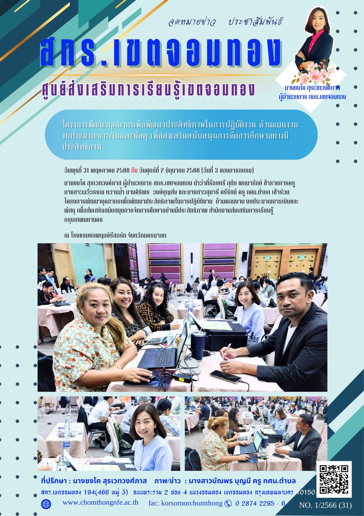 วันศุกร์ที่ 2 มิถุนายน 2566 (วันที่ 3 ของการอบรม) นางชงโค สุรเวทวงศ์ภาส ผู้อำนวยการ สกร.เขตจอมทอง นำ