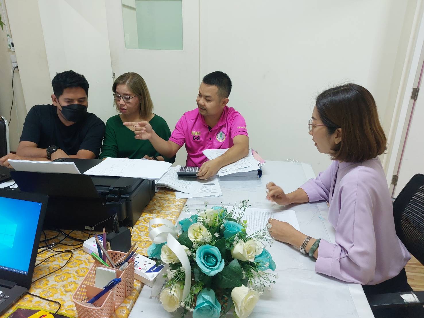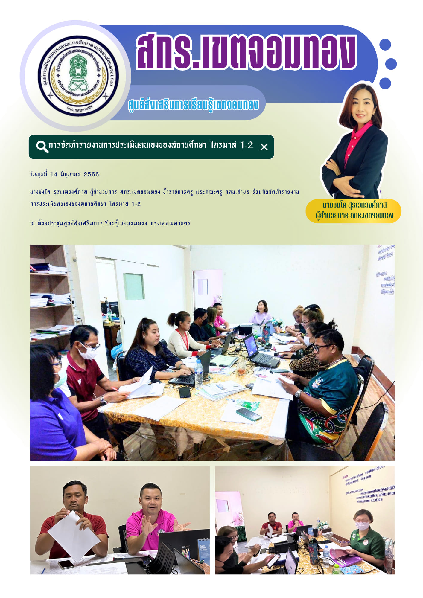 วันพุธที่ 14 มิถุนายน 2566 นางชงโค สุรเวทวงศ์ภาส ผู้อำนวยการ สกร.เขตจอมทอง ข้าราชการครู และคณะครู กศน.ตำบล ร่วมกันจัดทำรายงานการประเมินตนเองของสถานศึกษา ไตรมาส 1-2 ณ ห้องประชุมศูนย์ส่งเสริมการเรียนรู