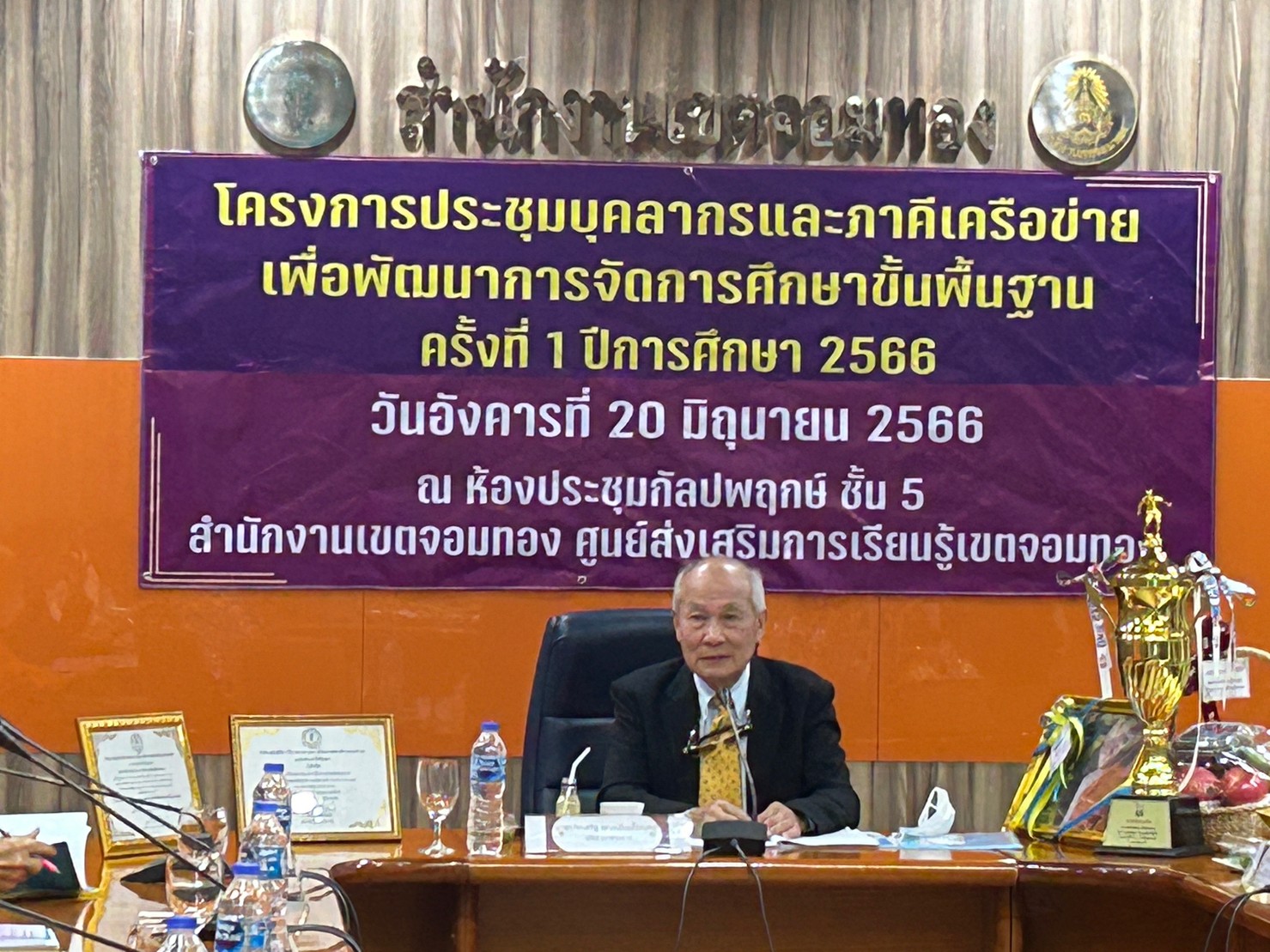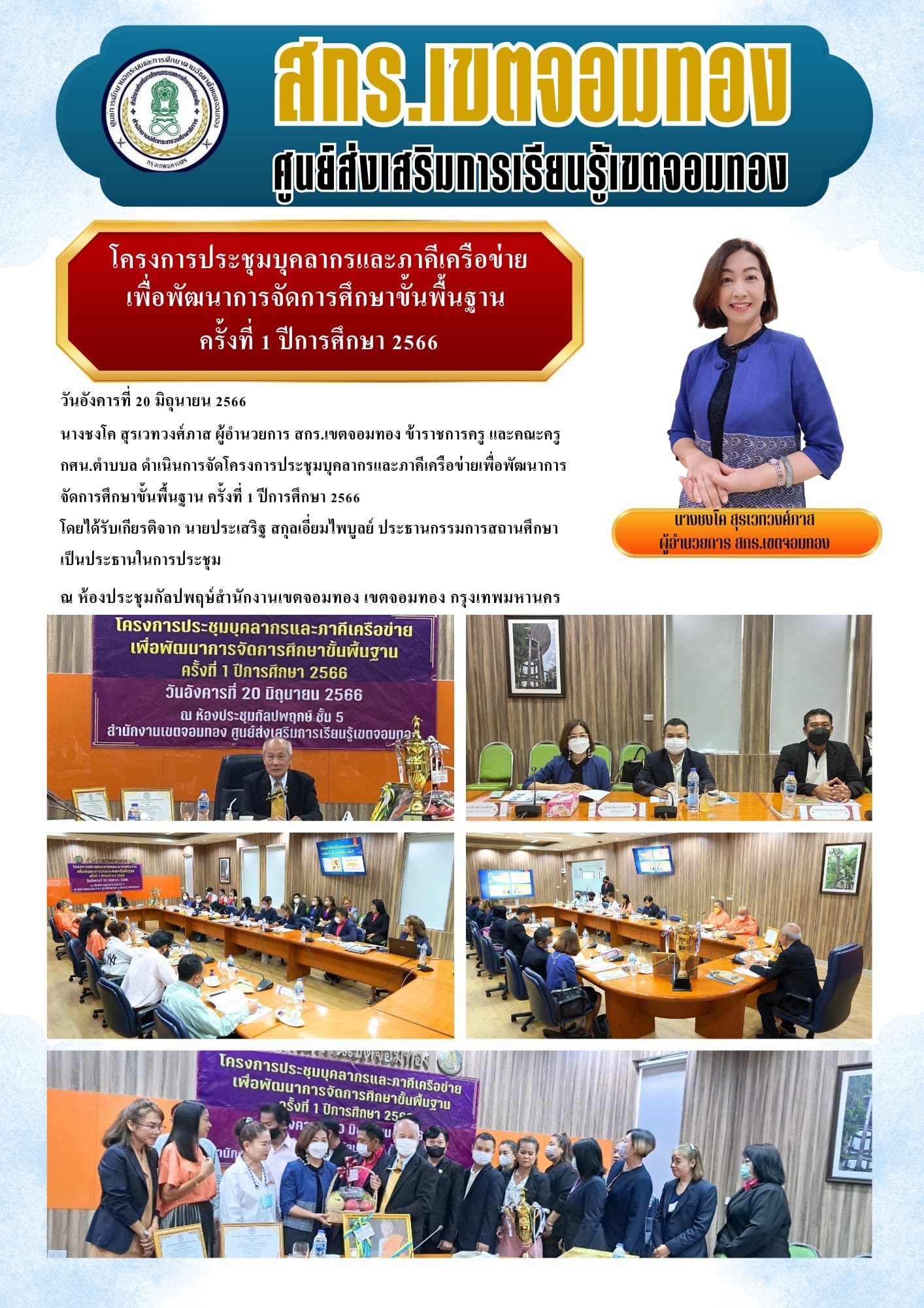 วันอังคารที่ 20 มิถุนายน 2566 นางชงโค สุรเวทวงศ์ภาส ผู้อำนวยการ สกร.เขตจอมทอง ข้าราชการครู และคณะครูกศน.ตำบบล ดำเนินการจัดโครงการประชุมบุคลากรและภาคีเครือข่ายเพื่อพัฒนาการจัดการศึกษาขั้นพื้นฐาน ครั้งท