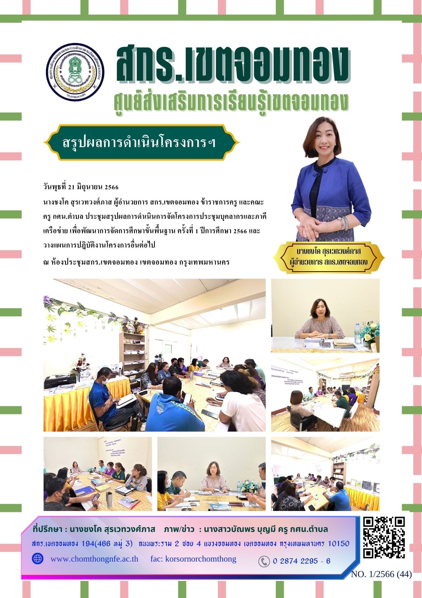 วันพุธที่ 21 มิถุนายน 2566 นางชงโค สุรเวทวงศ์ภาส ผู้อำนวยการ สกร.เขตจอมทอง ข้าราชการครู และคณะครู กศน.ตำบล ประชุมสรุปผลการดำเนินการจัดโครงการประชุมบุคลากรและภาคีเครือข่าย เพื่อพัฒนาการจัดการศึกษาขั้นพ