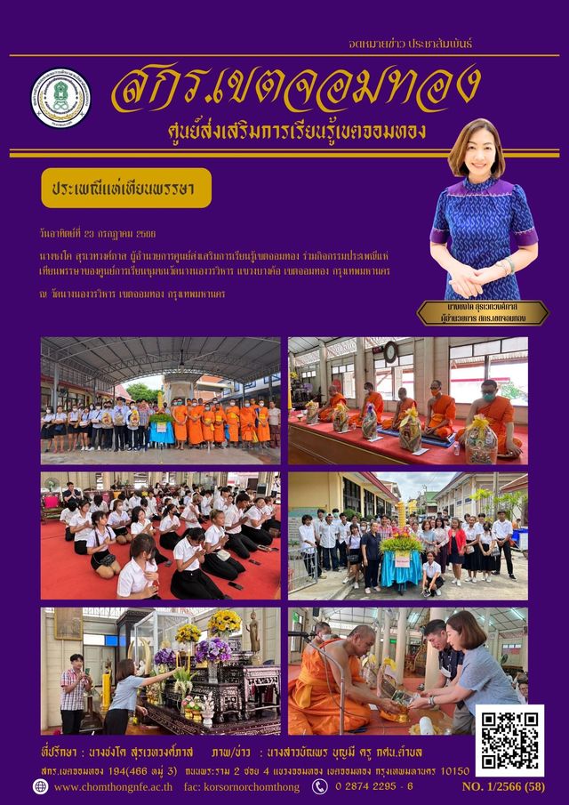 วันอาทิตย์ที่ 23 กรกฏาคม 2566 นางชงโค สุรเวทวงศ์ภาส ผู้อำนวยการศูนย์ส่งเสริมการเรียนรู้เขตจอมทอง ร่วมกิจกรรมประเพณีแห่เทียนพรรษาของศูนย์การเรียนชุมชนวัดนางนองวรวิหาร แขวงบางค้อ เขตจอมทอง กรุงเทพมหานคร