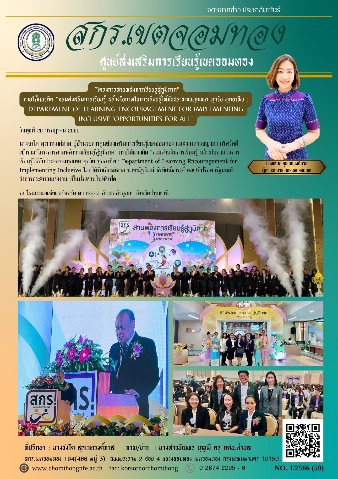 วันพุธที่ 26 กรกฏาคม 2566 นางชงโค สุรเวทวงศ์ภาส ผู้อำนวยการศูนย์ส่งเสริมการเรียนรู้เขตจอมทอง และนางสาวชญาภา ศรีสวัสดิ์ เข้าร่วม"โครงการสานพลังการเรียนรู้สู่ภูมิภาค" ภายใต้แนวคิด "กรมส่งสริมการเรียนรู้