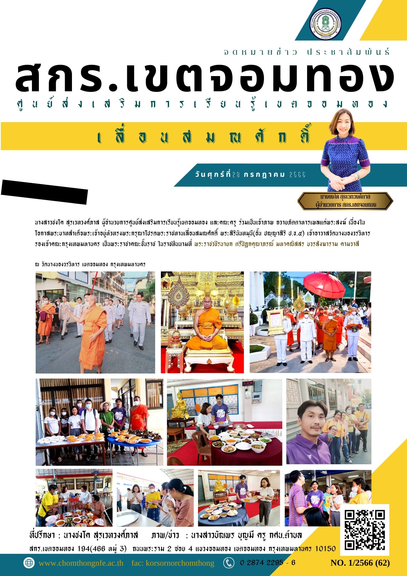 วันศุกร์ที่ 28 กรกฎาคม 2566 นางสาวชงโค สุรเวทวงศ์ภาส ผู้อำนวยการศูนย์ส่งเสริมการเรียนรู้เขตจอมทอง และคณะครู ร่วมเป็นเจ้าภาพ ถวายภัตตาหารเพลแด่พระสงฆ์ เนื่องในโอกาสพระบาทสำเด็จพระเจ้าอยู่หัวทรงพระกรุณา