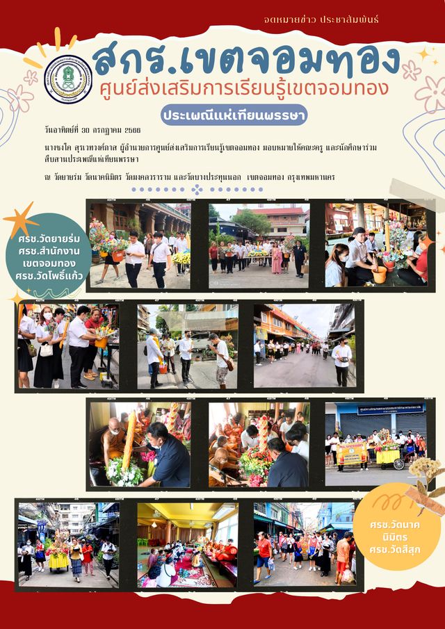 วันอาทิตย์ที่ 30 กรกฏาคม 2566 นางชงโค สุรเวทวงศ์ภาส ผู้อำนวยการศูนย์ส่งเสริมการเรียนรู้เขตจอมทอง มอบหมายให้คณะครู และนักศึกษาร่วมสืบสานประเพณีแห่เทียนพรรษา ณ วัดยายร่ม วัดนาคนิมิตร วัดมงคลวราราม และว