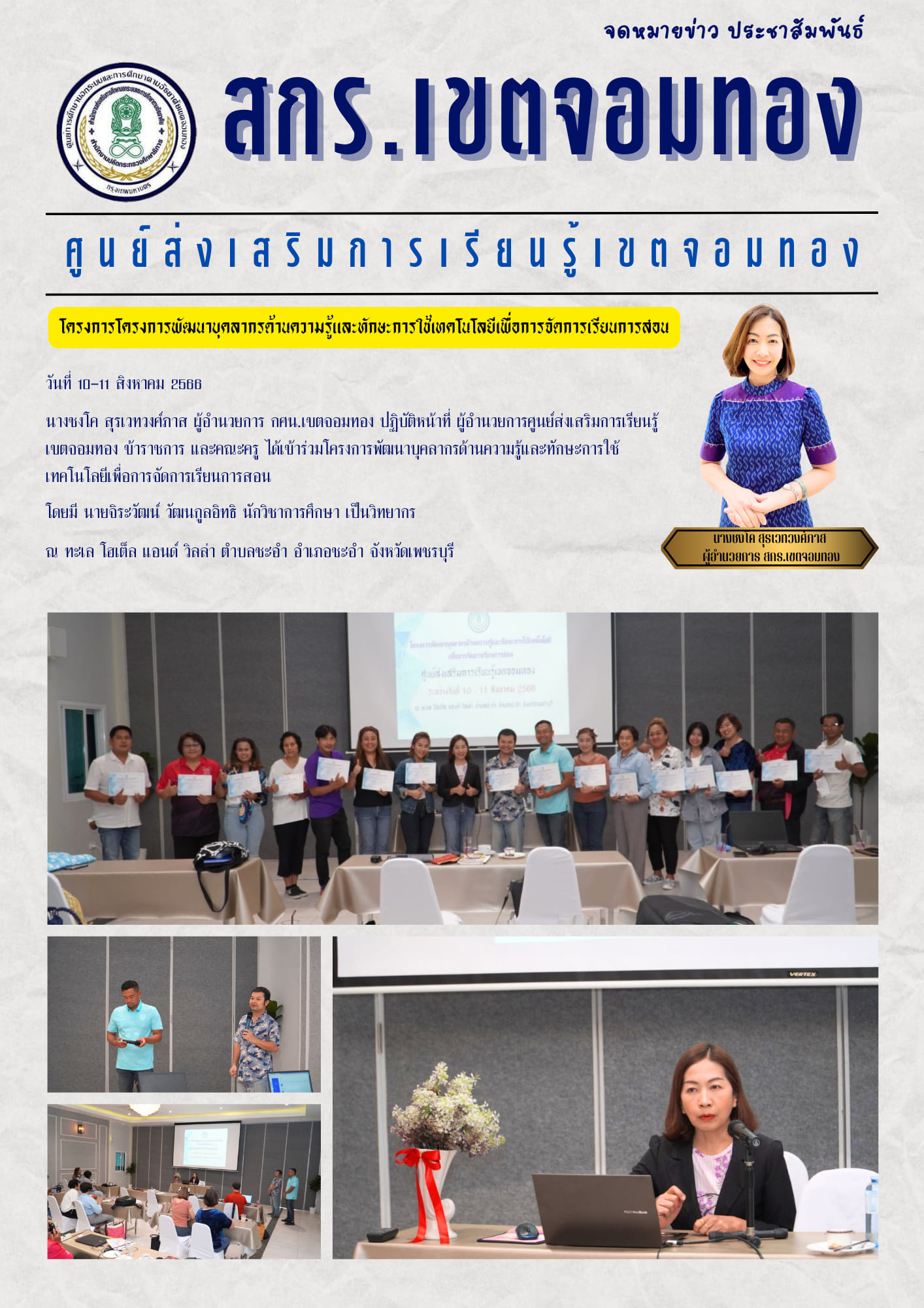 วันที่ 10-11 สิงหาคม 2566 นางชงโค สุรเวทวงศ์ภาส ผู้อำนวยการ กศน.เขตจอมทอง ปฏิบัติหน้าที่ ผู้อำนวยการศูนย์ส่งเสริมการเรียนรู้เขตจอมทอง ข้าราชการครู และคณะครู เข้าร่วมโครงการพัฒนาบุคลากรด้านความรู้และทั
