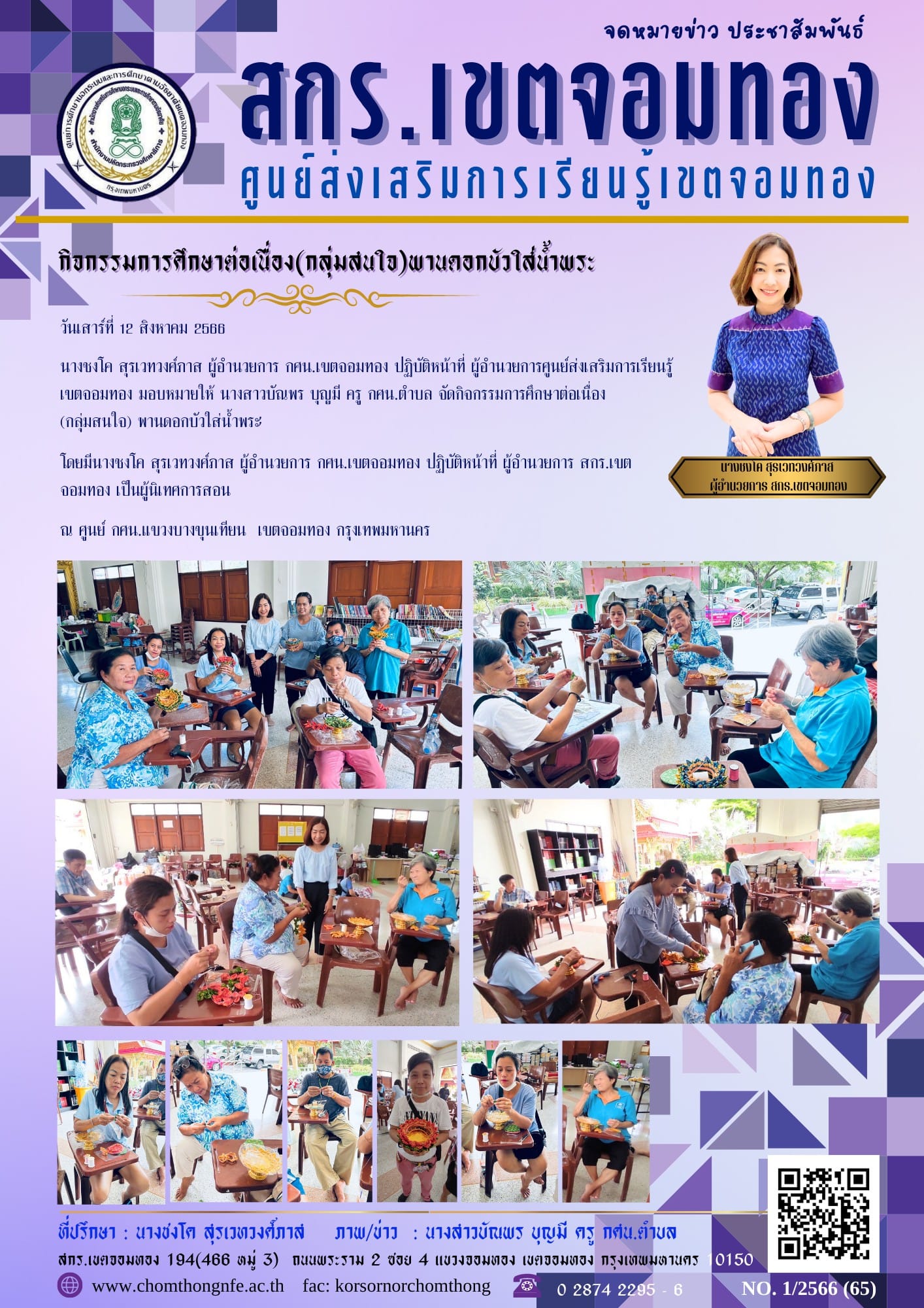 วันเสาร์ที่ 12 สิงหาคม 2566 นางชงโค สุรเวทวงศ์ภาส ผู้อำนวยการ กศน.เขตจอมทอง ปฏิบัติหน้าที่ ผู้อำนวยก